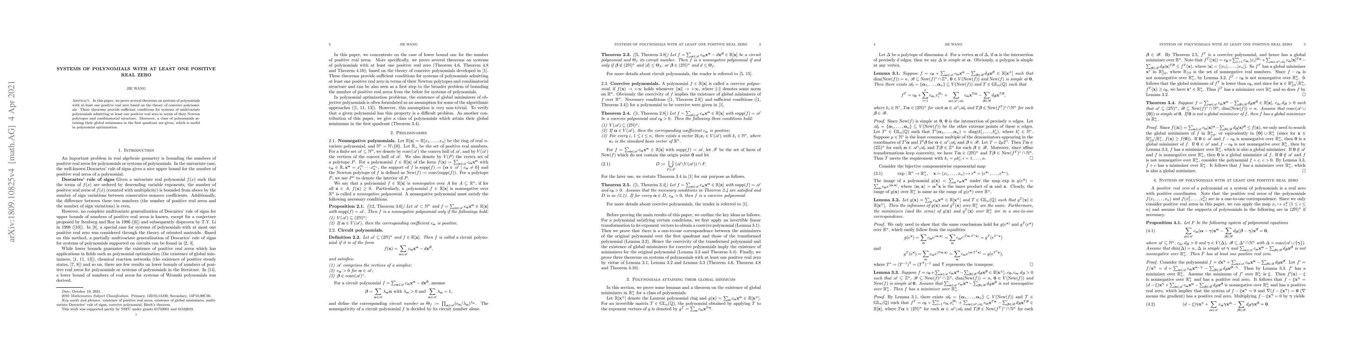 This paper proves theorems about systems of multivariate polynomials with at least one positive real zero, establishing conditions based on Newton polytopes and combinatorial structures, and identifies a class of polynomials with global minimums in the first quadrant for polynomial optimization.