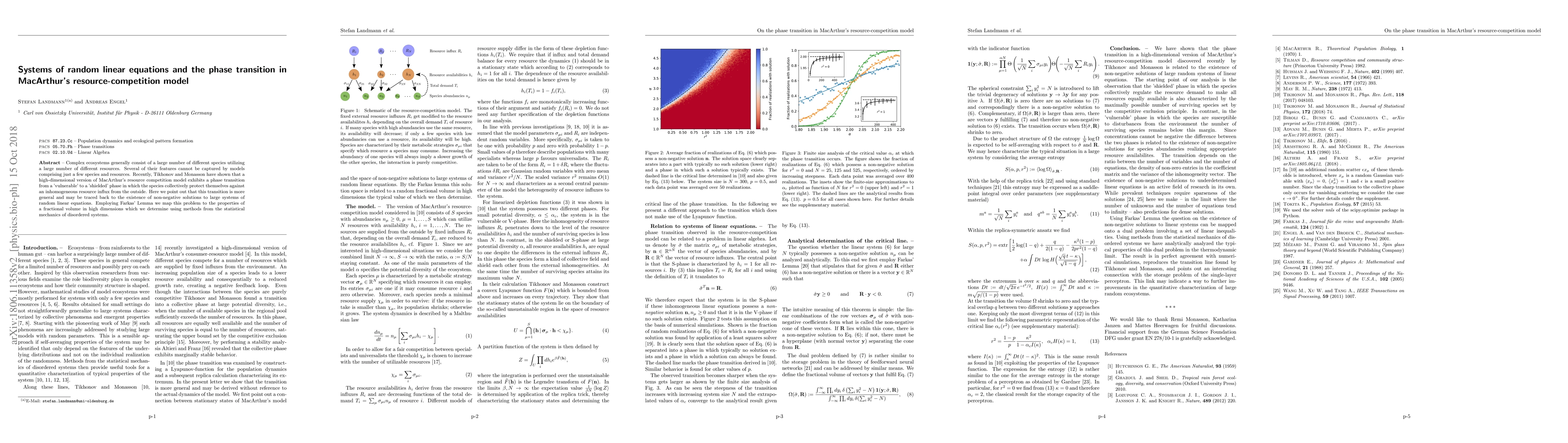 This paper investigates the phase transition in MacArthur's resource-competition model, showing that it is linked to the existence of non-negative solutions in large systems of random linear equations. The authors use Farkas' Lemma and statistical mechanics to determine the fractional volume responsible for the transition from a 'vulnerable' to a 'shielded' phase.