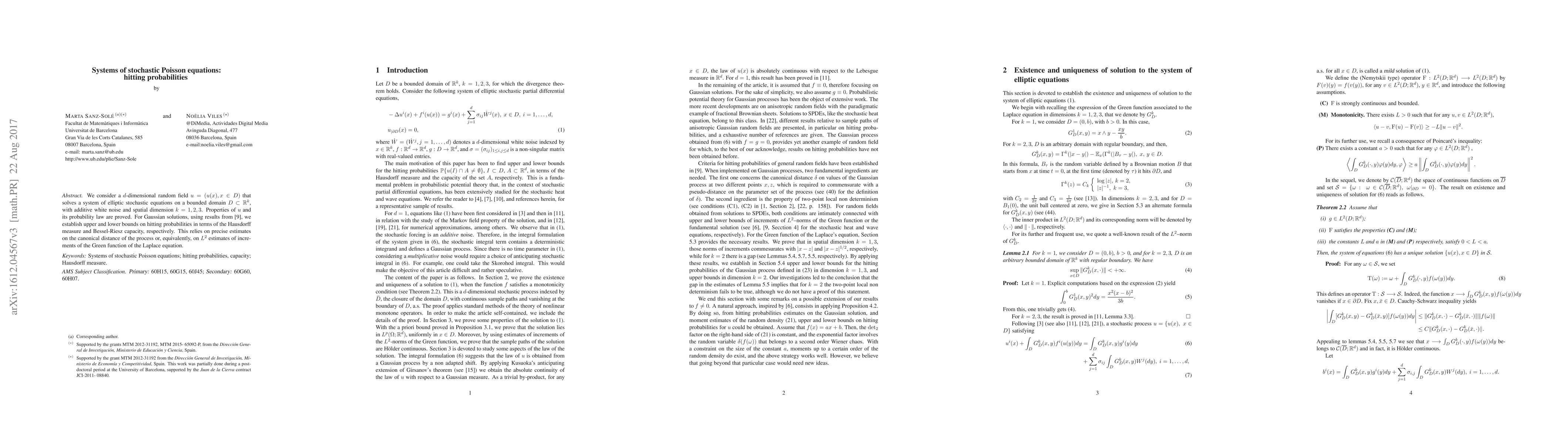 This paper investigates a $d$-dimensional random field $u$ solving stochastic Poisson equations in a bounded domain, proving properties of $u$ and its probability law. The study establishes upper and lower bounds on hitting probabilities for Gaussian solutions, leveraging the Hausdorff measure and Bessel-Riesz capacity, respectively.