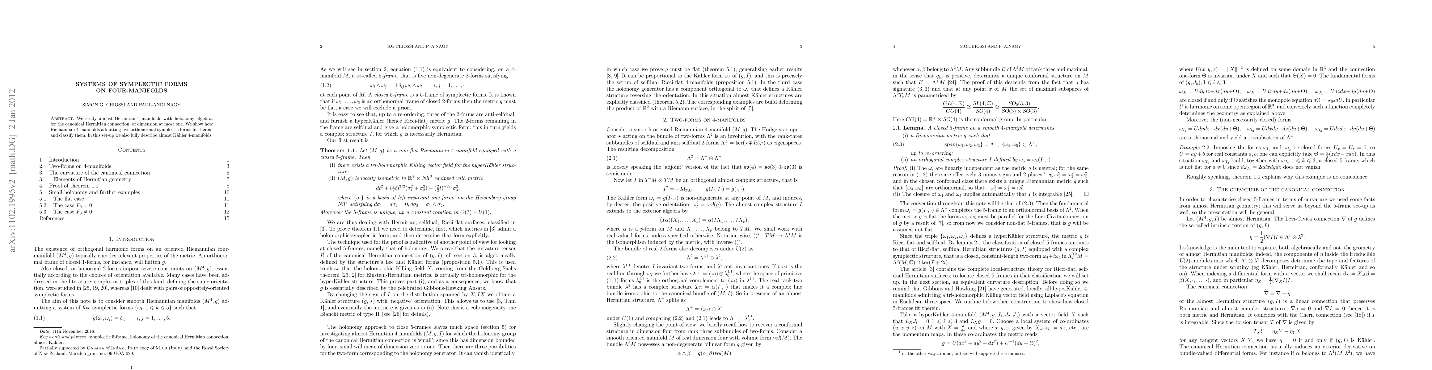 This paper explores almost Hermitian 4-manifolds with small-dimensional holonomy algebras, classifying Riemannian 4-manifolds that can support five orthonormal symplectic forms and detailing the properties of almost Kähler 4-manifolds within this context.