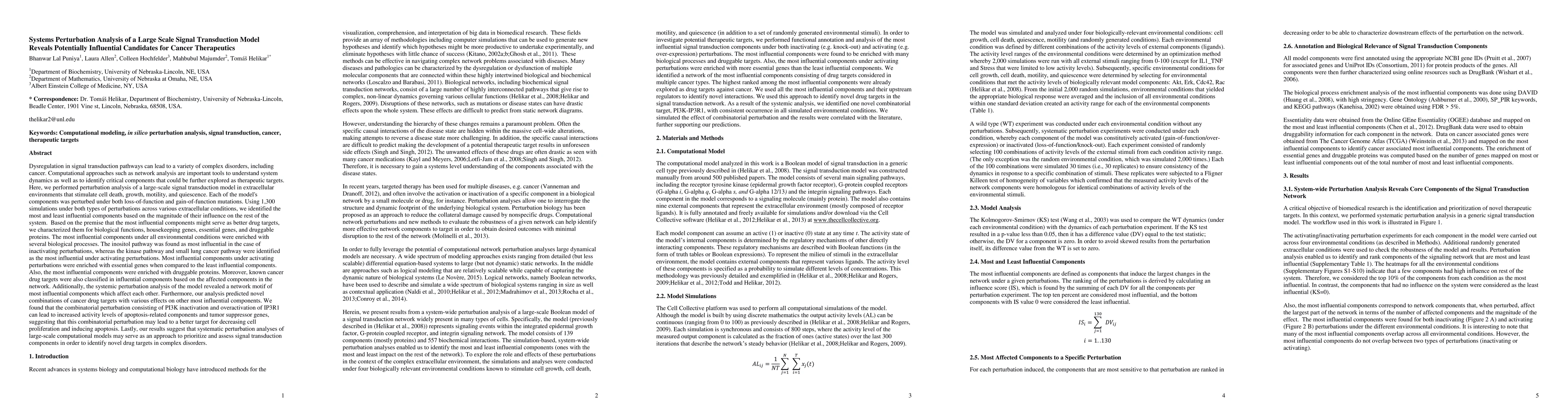 Dysregulation in signal transduction pathways can lead to a variety of complex disorders, including cancer. Computational approaches such as network analysis are important tools to understand system dynamics as well as to identify critical components that could be further explored as therapeutic targets. Here, we performed perturbation analysis of a large-scale signal transduction model in extracellular environments that stimulate cell death, growth, motility, and quiescence. Each of the model's components was perturbed under both loss-of-function and gain-of-function mutations. We identified the most and least influential components based on the magnitude of their influence on the rest of the system. Based on the premise that the most influential components might serve as better drug targets, we characterized them for biological functions, housekeeping genes, essential genes, and druggable proteins. Moreover, known cancer drug targets were also classified in influential components based on the affected components in the network. Additionally, the systemic perturbation analysis of the model revealed a network motif of most influential components which affect each other. Furthermore, our analysis predicted novel combinations of cancer drug targets with various effects on other most influential components. We found that the combinatorial perturbation consisting of PI3K inactivation and overactivation of IP3R1 can lead to increased activity levels of apoptosis-related components and tumor suppressor genes, suggesting that this combinatorial perturbation may lead to a better target for decreasing cell proliferation and inducing apoptosis. Lastly, our results suggest that systematic perturbation analyses of large-scale computational models may serve as an approach to prioritize and assess signal transduction components in order to identify novel drug targets in complex disorders.