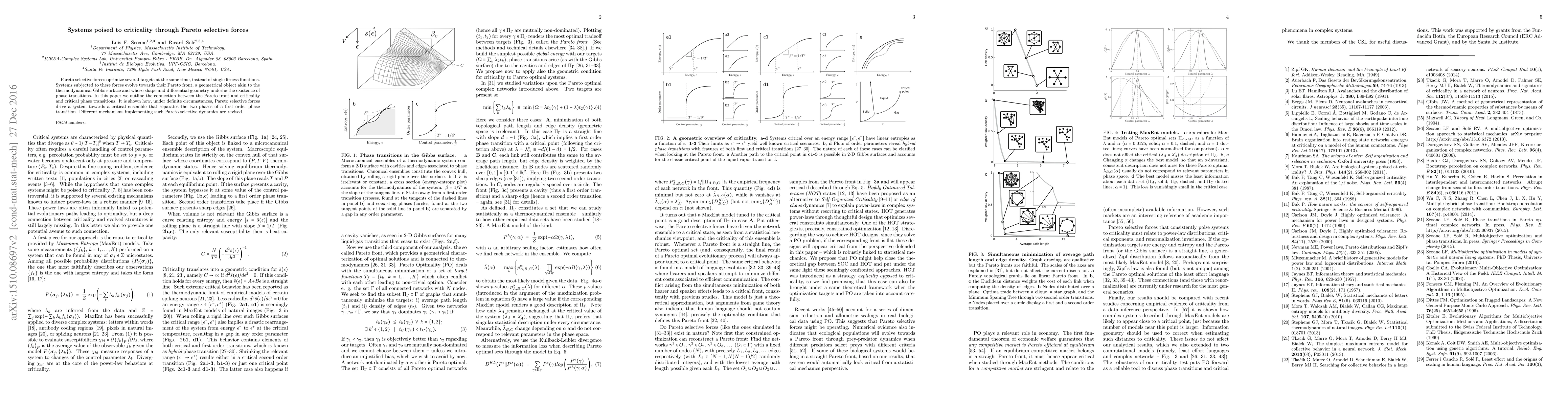 This paper explores how Pareto selective forces, which optimize multiple targets simultaneously, guide systems towards their Pareto front, akin to the Gibbs surface in thermodynamics. It establishes the link between the Pareto front and criticality, demonstrating how these forces can lead to critical phase transitions and the emergence of critical ensembles.