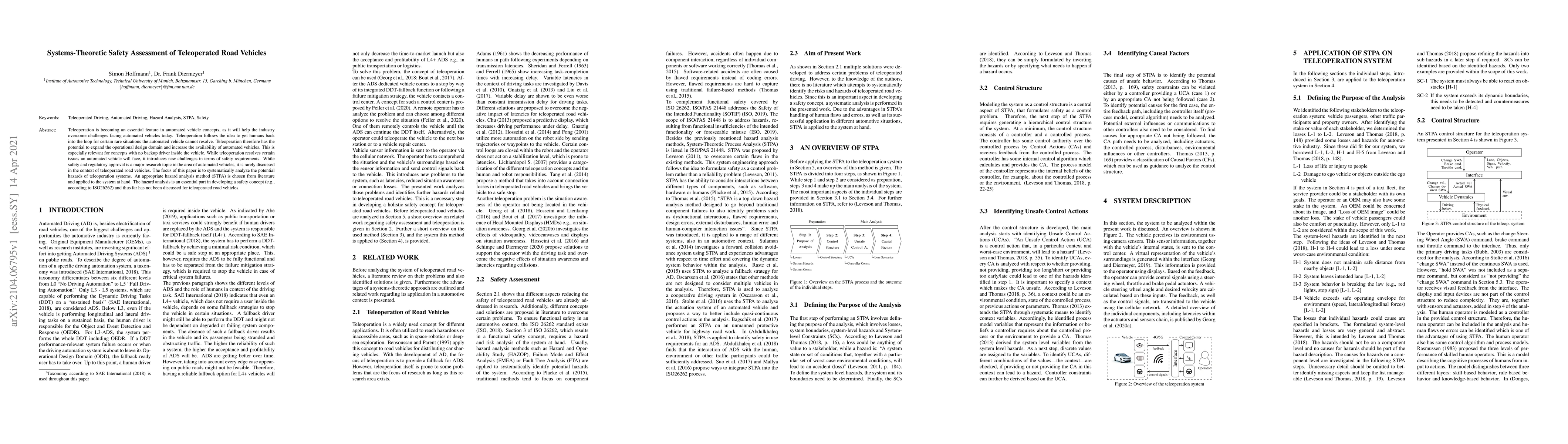This paper examines the safety challenges of teleoperated road vehicles using systems-theoretic hazard analysis, specifically the STPA method, to identify and assess potential hazards. It aims to develop a safety concept for teleoperation systems, addressing issues not previously explored in the context of automated vehicles.