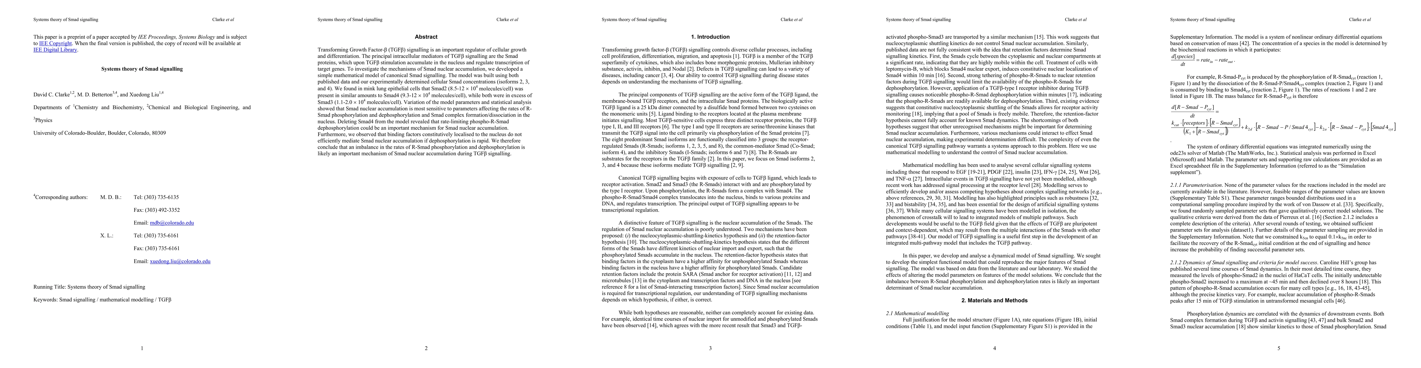 This study models Smad signaling in TGF-beta pathways, revealing that rapid phospho-R-Smad dephosphorylation is crucial for Smad nuclear accumulation, with imbalance in phosphorylation and dephosphorylation rates being a key mechanism.