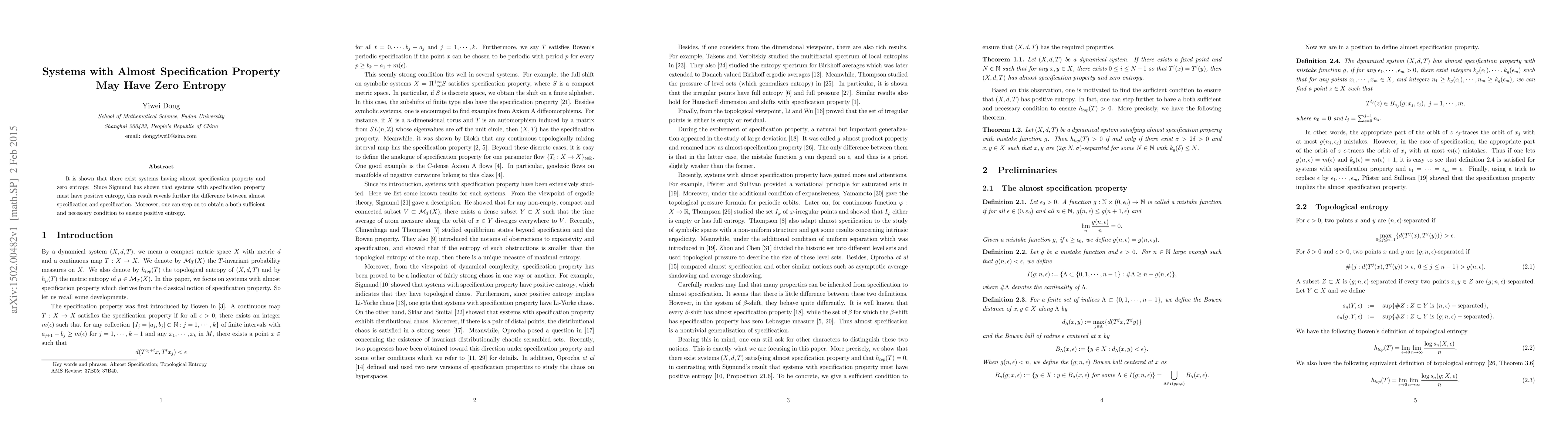 This paper demonstrates that systems with the almost specification property can exhibit zero entropy, contrasting with the positive entropy required for systems with the specification property, as shown by Sigmund. It also provides a condition ensuring positive entropy.