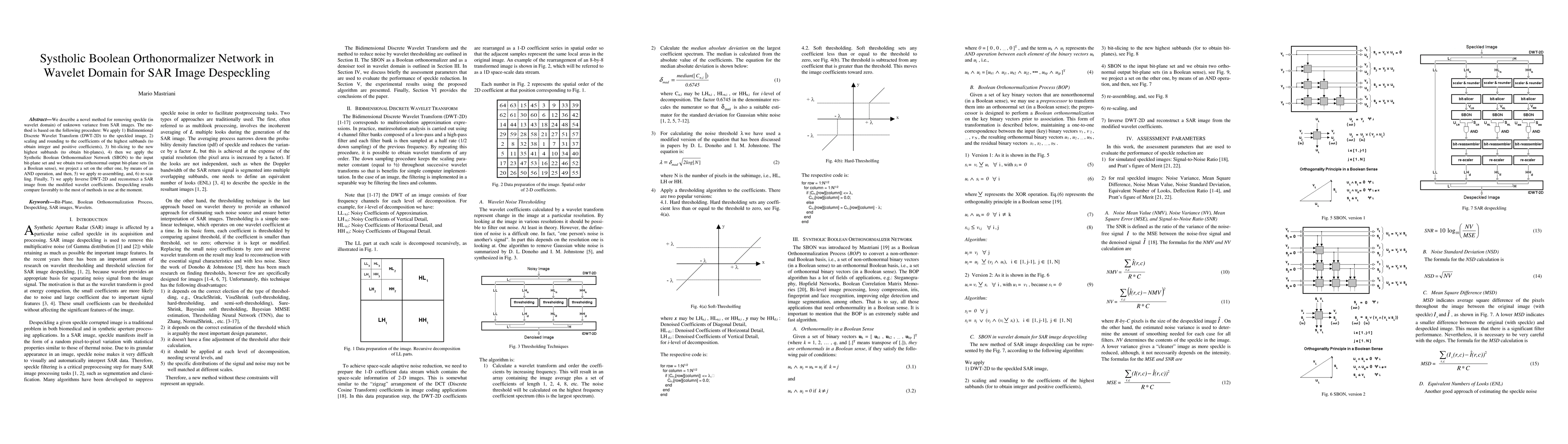 We describe a novel method for removing speckle (in wavelet domain) of unknown variance from SAR images. The me-thod is based on the following procedure: We apply 1) Bidimentional Discrete Wavelet Transform (DWT-2D) to the speckled image, 2) scaling and rounding to the coefficients of the highest subbands (to obtain integer and positive coefficients), 3) bit-slicing to the new highest subbands (to obtain bit-planes), 4) then we apply the Systholic Boolean Orthonormalizer Network (SBON) to the input bit-plane set and we obtain two orthonormal output bit-plane sets (in a Boolean sense), we project a set on the other one, by means of an AND operation, and then, 5) we apply re-assembling, and, 6) re-sca-ling. Finally, 7) we apply Inverse DWT-2D and reconstruct a SAR image from the modified wavelet coefficients. Despeckling results compare favorably to the most of methods in use at the moment.