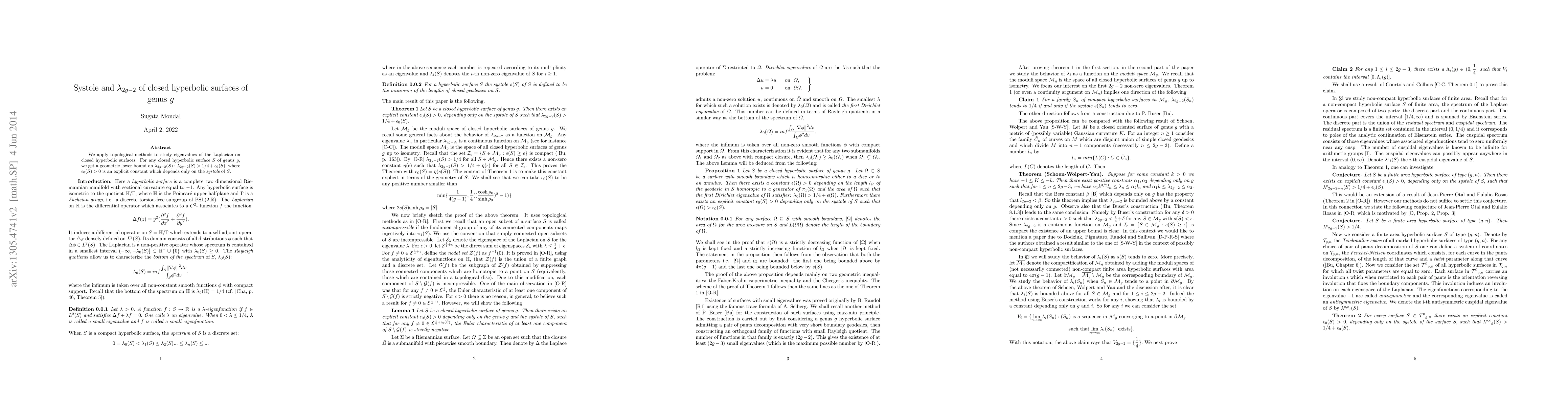This paper uses topological methods to derive a geometric lower bound for the $(2g-2)$-th eigenvalue of the Laplacian on closed hyperbolic surfaces, showing that it exceeds $1/4$ plus a positive constant dependent on the surface's systole.