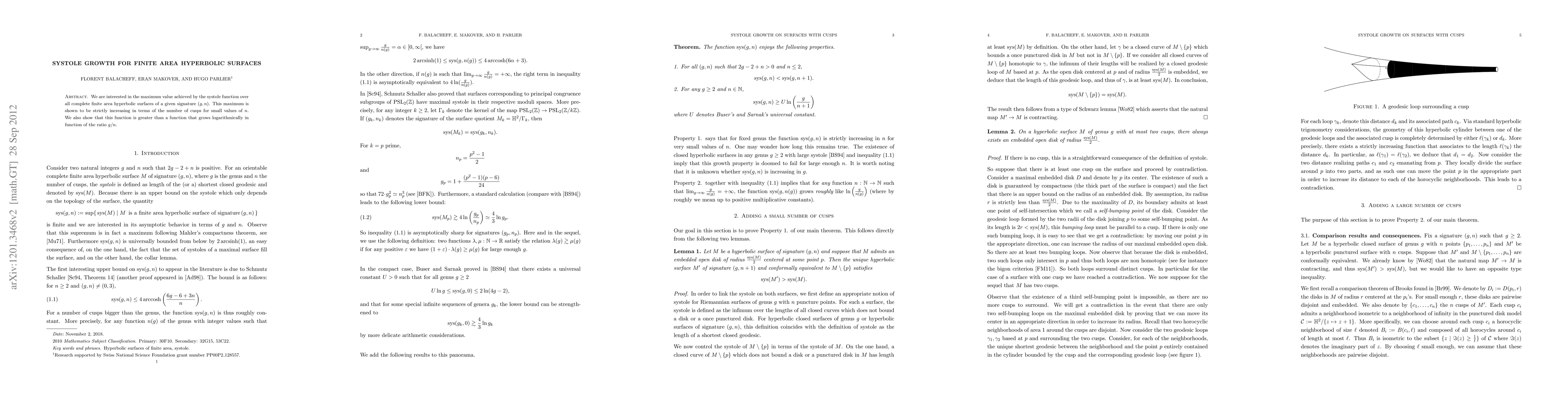 The paper investigates the maximum value of the systole function for finite area hyperbolic surfaces of a given signature $(g,n)$, demonstrating that it increases with the number of cusps for small $n$ and exceeds a logarithmically growing function of $g/n$.
