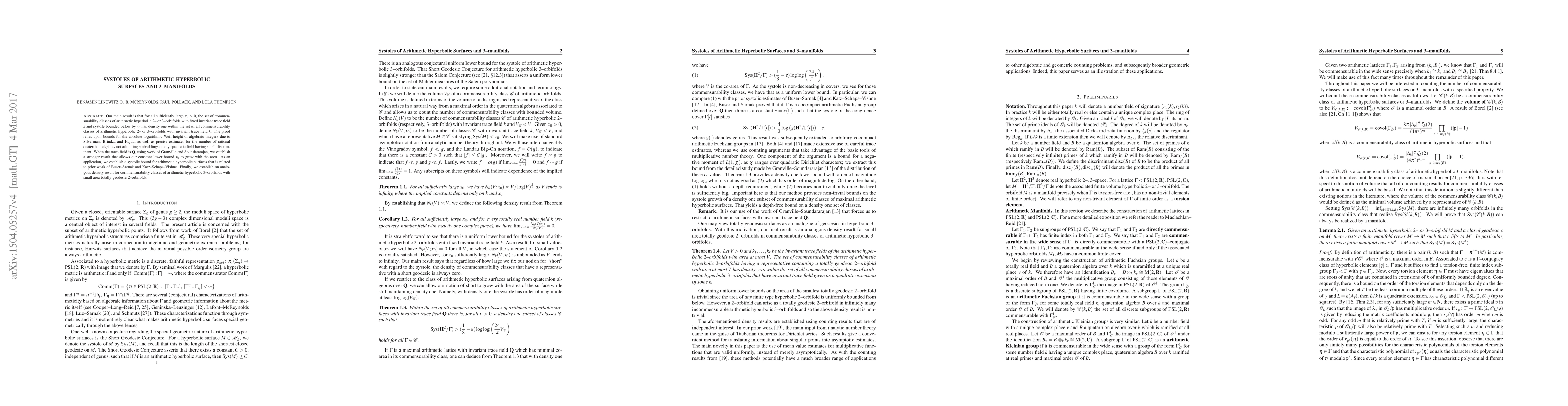 Our main result is that for all sufficiently large $x_0>0$, the set of commensurability classes of arithmetic hyperbolic 2- or 3-orbifolds with fixed invariant trace field $k$ and systole bounded below by $x_0$ has density one within the set of all commensurability classes of arithmetic hyperbolic 2- or 3-orbifolds with invariant trace field $k$. The proof relies upon bounds for the absolute logarithmic Weil height of algebraic integers due to Silverman, Brindza and Hajdu, as well as precise estimates for the number of rational quaternion algebras not admitting embeddings of any quadratic field having small discriminant. When the trace field is $\mathbf{Q}$, using work of Granville and Soundararajan, we establish a stronger result that allows our constant lower bound $x_0$ to grow with the area. As an application, we establish a systolic bound for arithmetic hyperbolic surfaces that is related to prior work of Buser-Sarnak and Katz-Schaps-Vishne. Finally, we establish an analogous density result for commensurability classes of arithmetic hyperbolic 3-orbifolds with small area totally geodesic $2$-orbifolds.