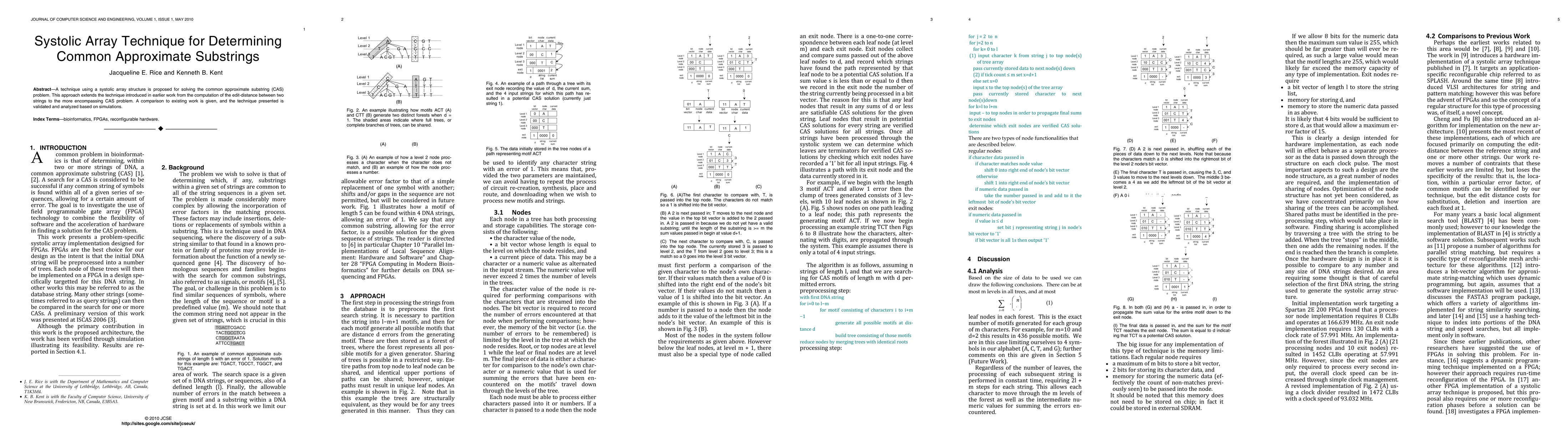 Summary: This paper proposes a systolic array technique to determine common approximate substrings (CAS) by extending previous methods for edit-distance computation. The approach is validated through simulations and compared to existing solutions.