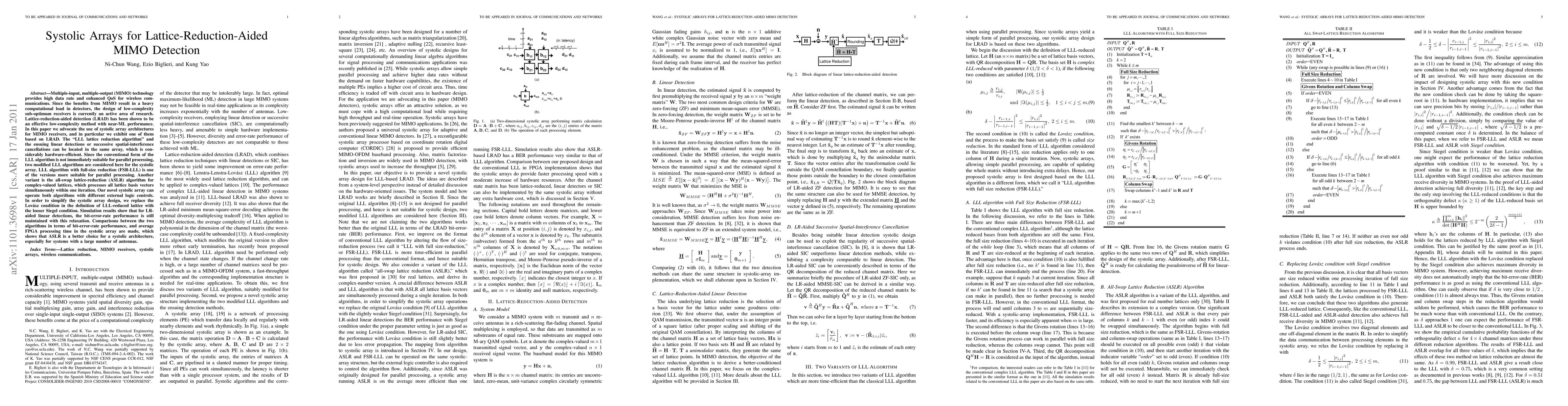 This paper proposes a systolic array architecture for lattice-reduction-aided detection (LRAD) in MIMO systems, comparing two modified LLL algorithms for efficient parallel processing. The systolic array can operate both the FSR-LLL and ASLR algorithms, showing that ASLR provides better performance for large antenna systems.