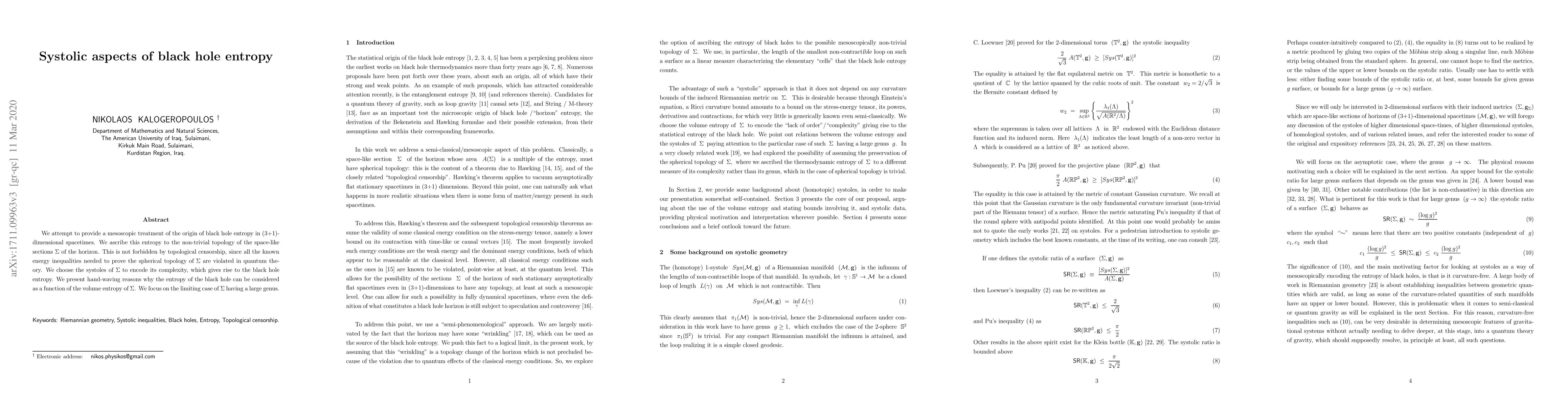 This paper explores a mesoscopic approach to black hole entropy, attributing it to the non-trivial topology of horizon space-like sections, $\Sigma$, which violates classical energy inequalities. The systoles of $\Sigma$ are proposed to encode its complexity, leading to the black hole entropy, with a focus on cases where $\Sigma$ has a large genus.