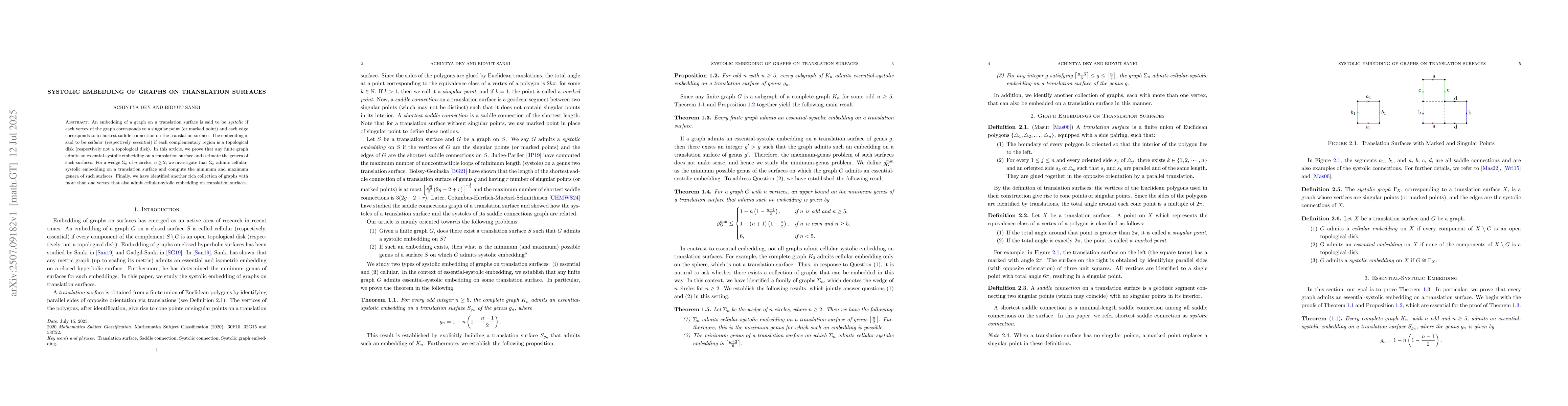 The paper presents novel theoretical results on the embedding of graphs on translation surfaces, specifically proving the existence of essential-systolic and cellular-systolic embeddings and providing bounds on the genera of the surfaces involved.