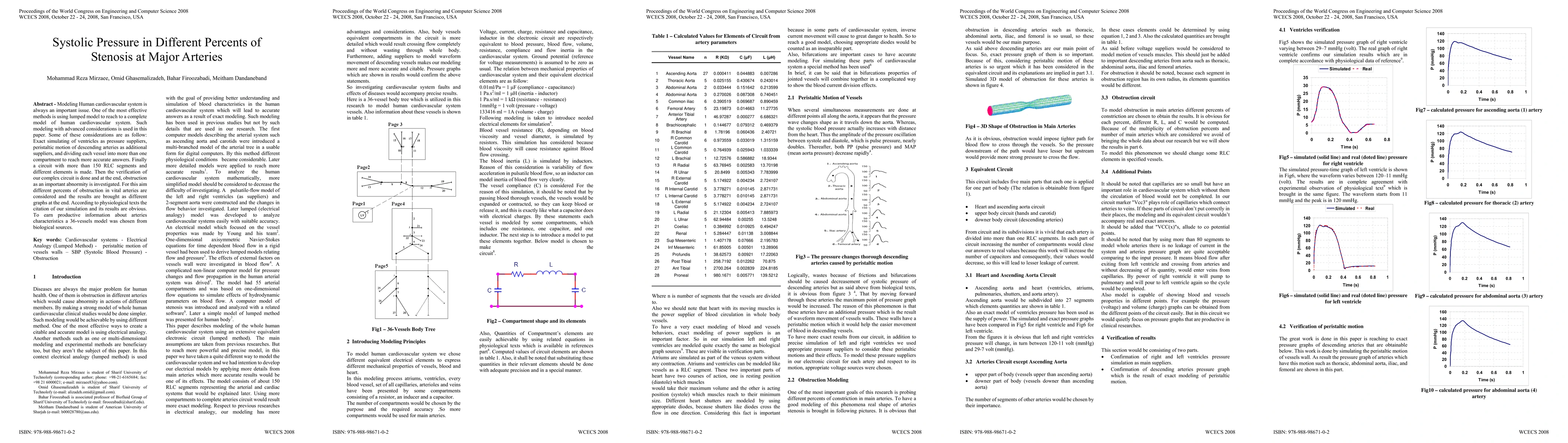 - Modeling Human cardiovascular system is always an important issue. One of the most effective methods is using lumped model to reach to a complete model of human cardiovascular system. Such modeling with advanced considerations is used in this paper. Some of these considerations are as follow: Exact simulating of ventricles as pressure suppliers, peristaltic motion of descending arteries as additional suppliers, and dividing each vessel into more than one compartment to reach more accurate answers. Finally a circuit with more than 150 RLC segments and different elements is made. Then the verification of our complex circuit is done and at the end, obstruction as an important abnormality is investigated. For this aim different percents of obstruction in vital arteries are considered and the results are brought as different graphs at the end. According to physiological texts the citation of our simulation and its results are obvious. To earn productive information about arteries characteristics a 36-vessels model was chosen from biological sources.