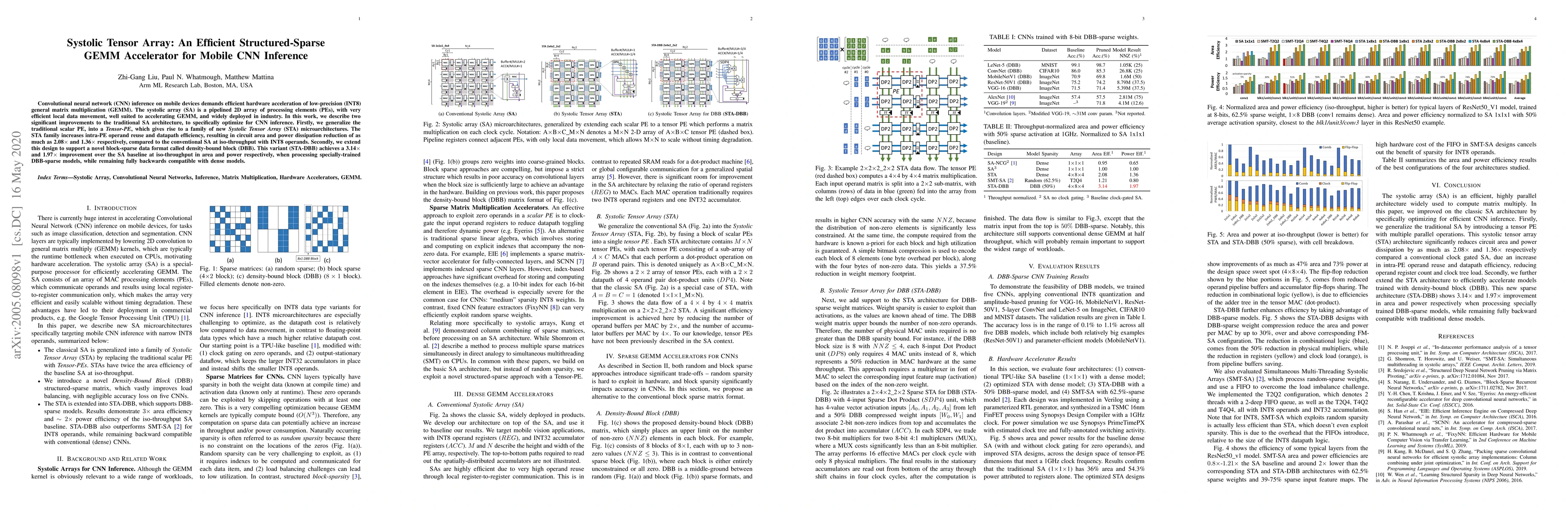 This paper proposes a Systolic Tensor Array (STA) microarchitecture to optimize systolic arrays for mobile CNN inference, achieving significant reductions in area and power dissipation. The STA enhances traditional systolic arrays with Tensor-PEs and supports a new density-bound block (DBB) sparse data format, leading to substantial improvements in efficiency for both sparse and dense models.