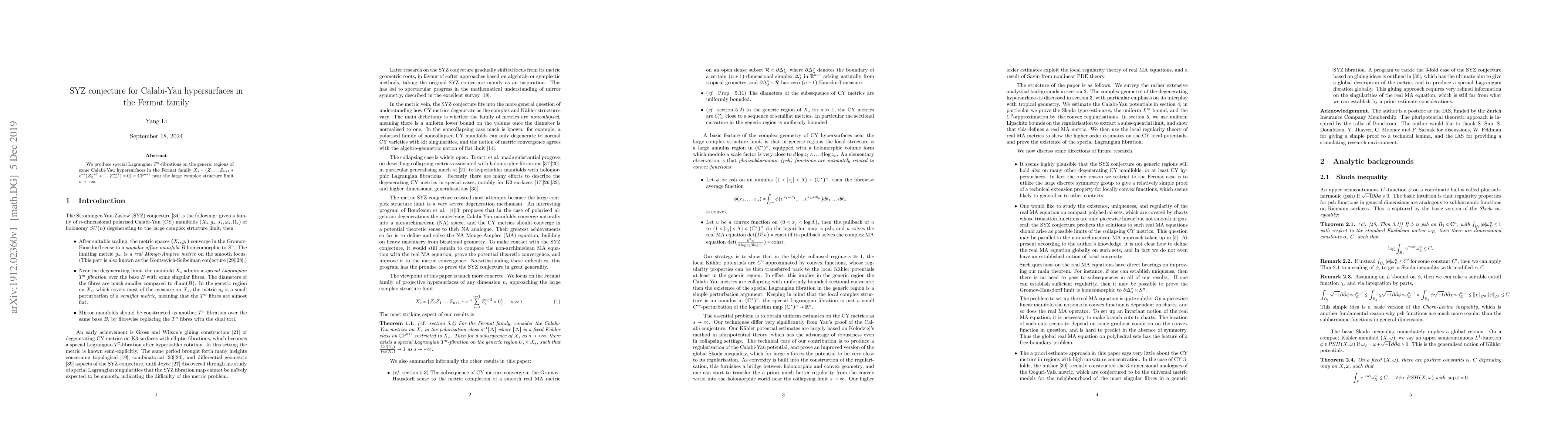 This paper constructs special Lagrangian $T^n$-fibrations on generic regions of Calabi-Yau hypersurfaces in the Fermat family near the large complex structure limit, addressing the SYZ conjecture. The focus is on the behavior of these fibrations as the parameter $s$ approaches infinity.