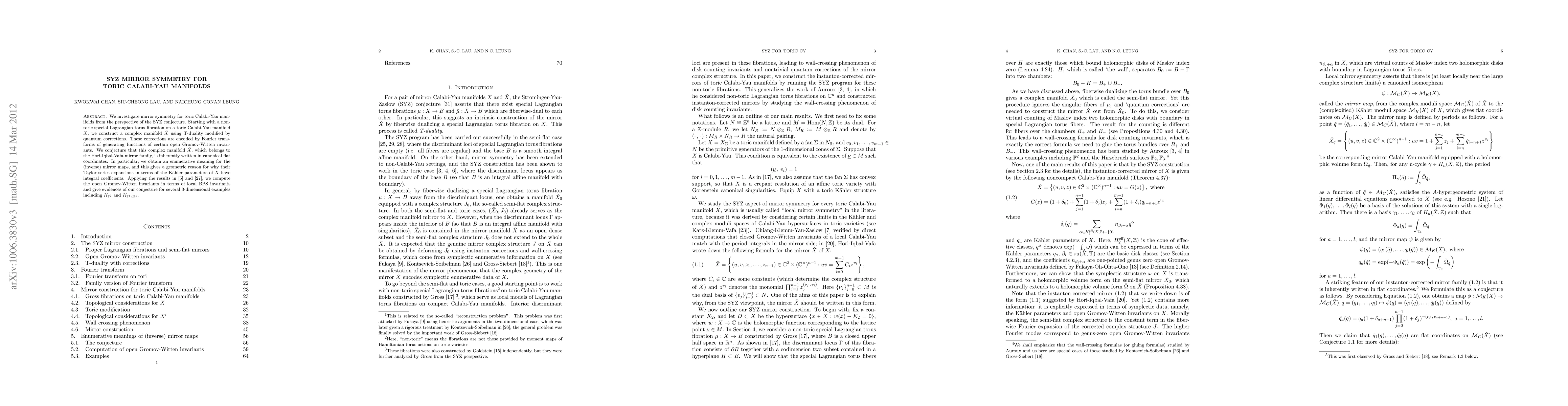 This research explores mirror symmetry for toric Calabi-Yau manifolds through the SYZ conjecture, constructing a complex manifold $\check{X}$ using T-duality with quantum corrections, which leads to integral coefficients in the Taylor series of mirror maps, and provides enumerative meaning for these maps, supported by examples like $K_{\proj^2}$ and $K_{\proj^1\times\proj^1}$.
