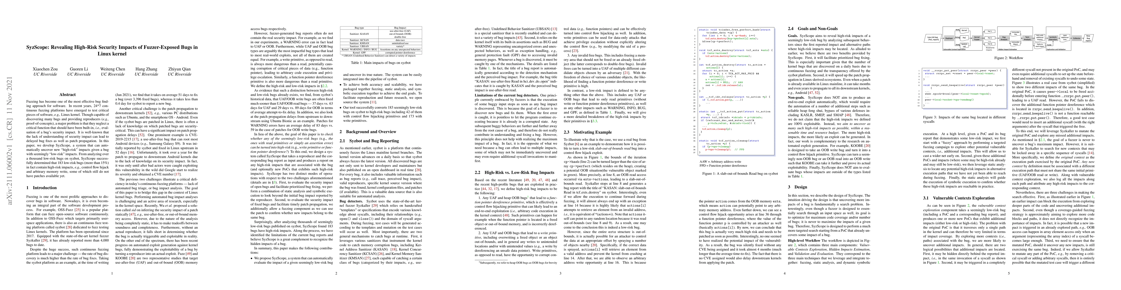 SyzScope is a system developed to automatically evaluate the security impact of bugs discovered by fuzzers in the Linux kernel, revealing that many seemingly low-risk bugs actually have high-risk impacts such as control flow hijack and arbitrary memory write. The study found that over 15% of analyzed low-risk bugs had significant security risks, some of which remain unpatched.