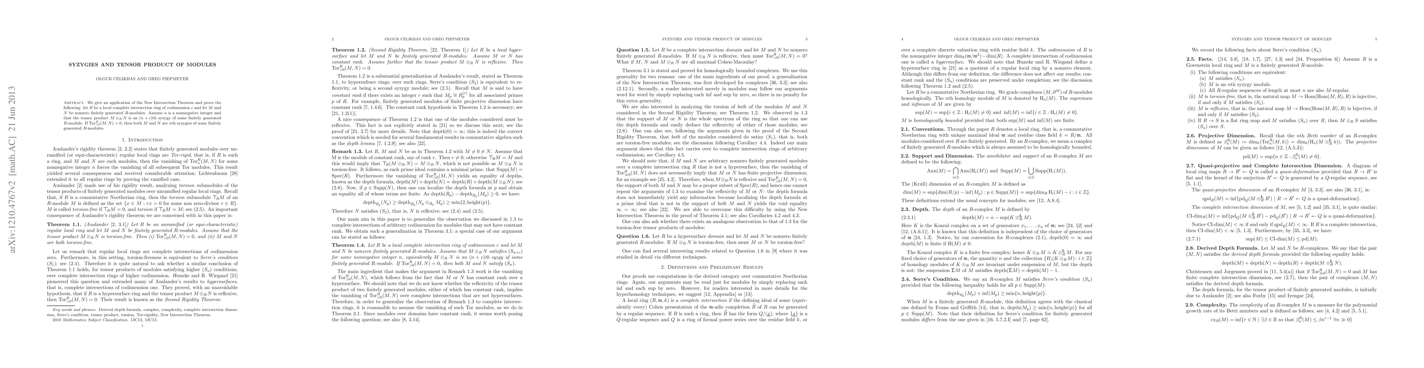 We give an application of the New Intersection Theorem and prove the following: let $R$ be a local complete intersection ring of codimension $c$ and let $M$ and $N$ be nonzero finitely generated $R$-modules. Assume $n$ is a nonnegative integer and that the tensor product $M\tensor_{R}N$ is an $(n+c)$th syzygy of some finitely generated $R$-module. If Tor$^{R}_{>0}(M,N)=0$, then both $M$ and $N$ are $n$th syzygies of some finitely generated $R$-modules.