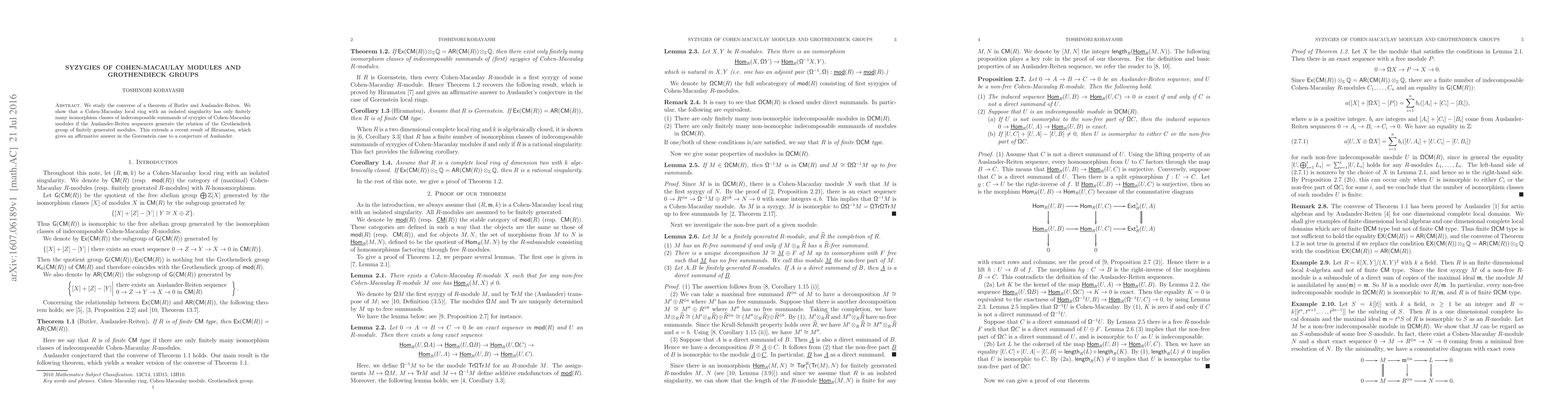 This paper investigates the converse of a theorem by Butler and Auslander-Reiten, demonstrating that Cohen-Macaulay local rings with isolated singularities have a finite number of indecomposable summands in the syzygies of Cohen-Macaulay modules when Auslander-Reiten sequences determine the Grothendieck group relations, extending a previous result in the Gorenstein case.