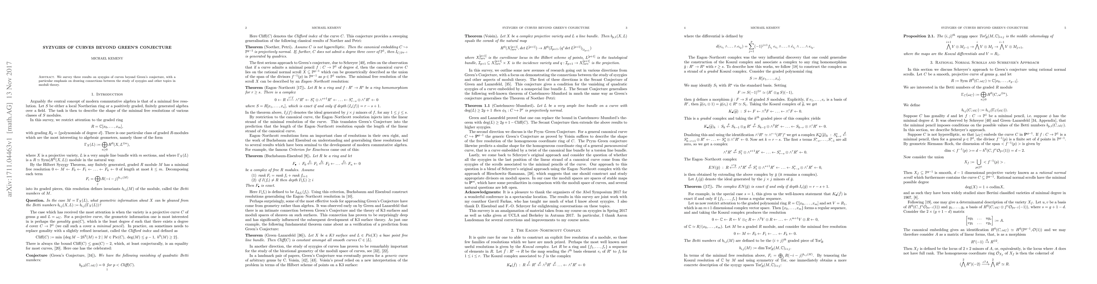 This paper surveys three results on syzygies of curves that extend beyond Green's conjecture, highlighting their connections to other areas in moduli theory. The focus is on how these syzygies relate to broader mathematical themes.