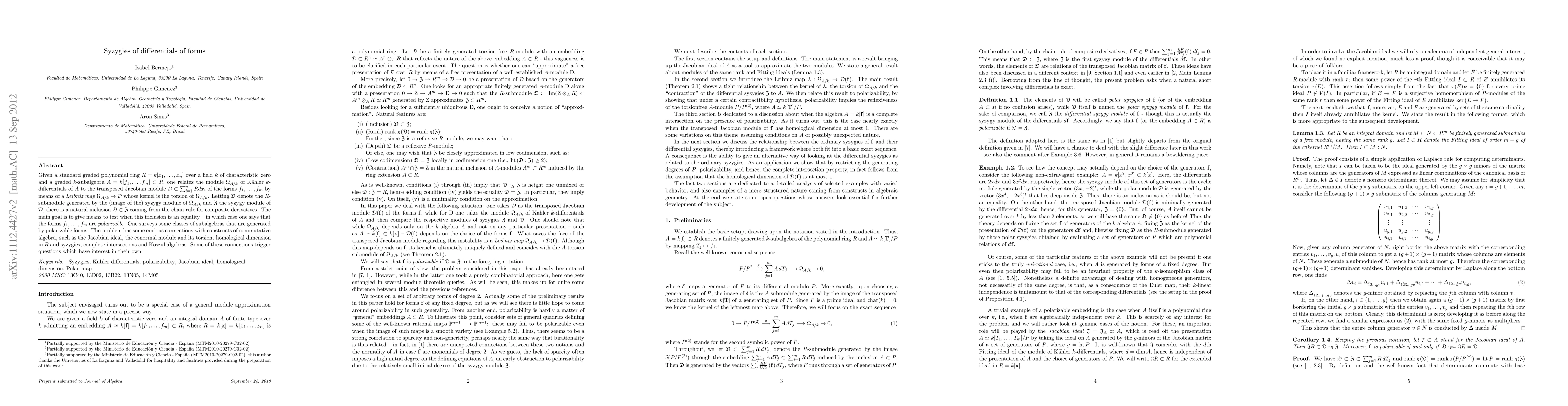 Given a standard graded polynomial ring $R=k[x_1,...,x_n]$ over a field $k$ of characteristic zero and a graded $k$-subalgebra $A=k[f_1,...,f_m]\subset R$, one relates the module $\Omega_{A/k}$ of K\"ahler $k$-differentials of $A$ to the transposed Jacobian module $\mathcal{D}\subset \sum_{i=1}^n R dx_i$ of the forms $f_1,...,f_m$ by means of a {\em Leibniz map} $\Omega_{A/k}\rar \mathcal{D}$ whose kernel is the torsion of $\Omega_{A/k}$. Letting $\fp$ denote the $R$-submodule generated by the (image of the) syzygy module of $\Omega_{A/k}$ and $\fz$ the syzygy module of $\mathcal{D}$, there is a natural inclusion $\fp\subset \fz$ coming from the chain rule for composite derivatives. The main goal is to give means to test when this inclusion is an equality -- in which case one says that the forms $f_1,...,f_m$ are {\em polarizable}. One surveys some classes of subalgebras that are generated by polarizable forms. The problem has some curious connections with constructs of commutative algebra, such as the Jacobian ideal, the conormal module and its torsion, homological dimension in $R$ and syzygies, complete intersections and Koszul algebras. Some of these connections trigger questions which have interest in their own.