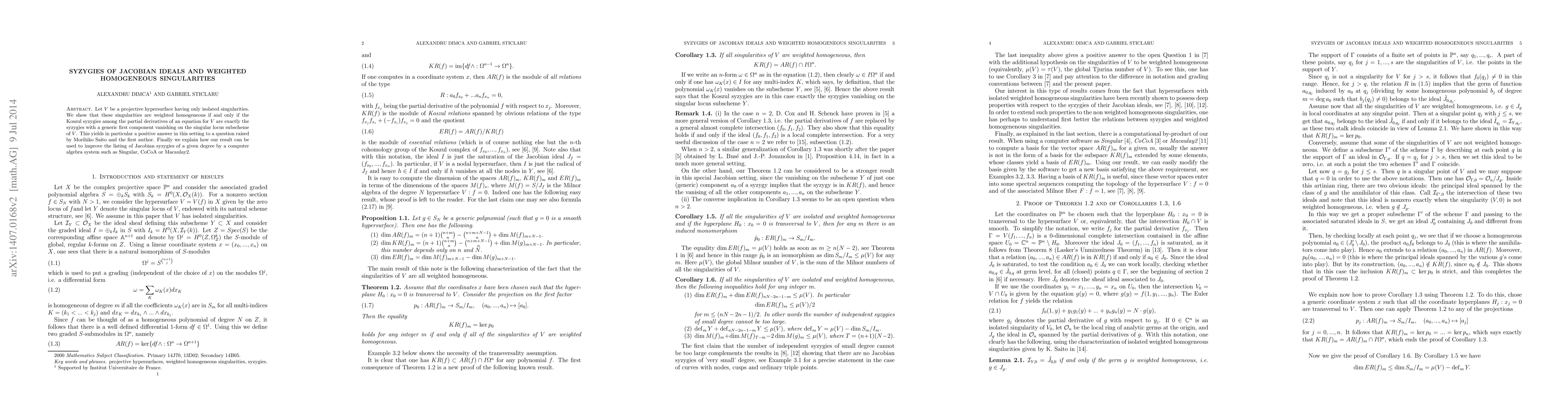 This paper demonstrates a connection between the weighted homogeneity of projective hypersurface singularities and the syzygies of their Jacobian ideals. It also provides a method to enhance the computational listing of Jacobian syzygies using algebraic software.