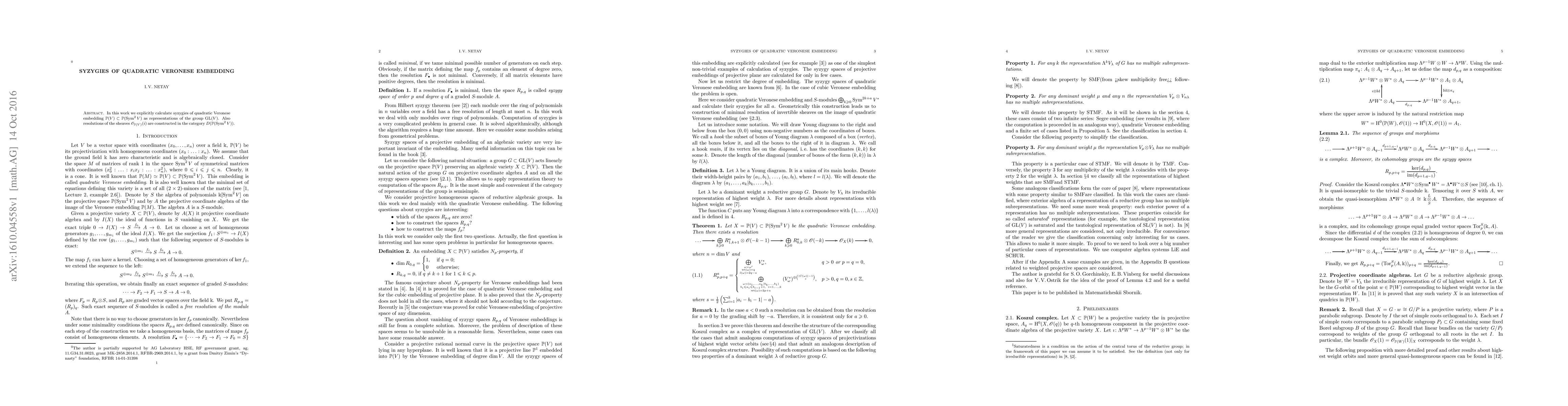 Researchers calculate syzygies of quadratic Veronese embedding as representations of GL(V) group and construct resolutions for sheaves on the projective space.