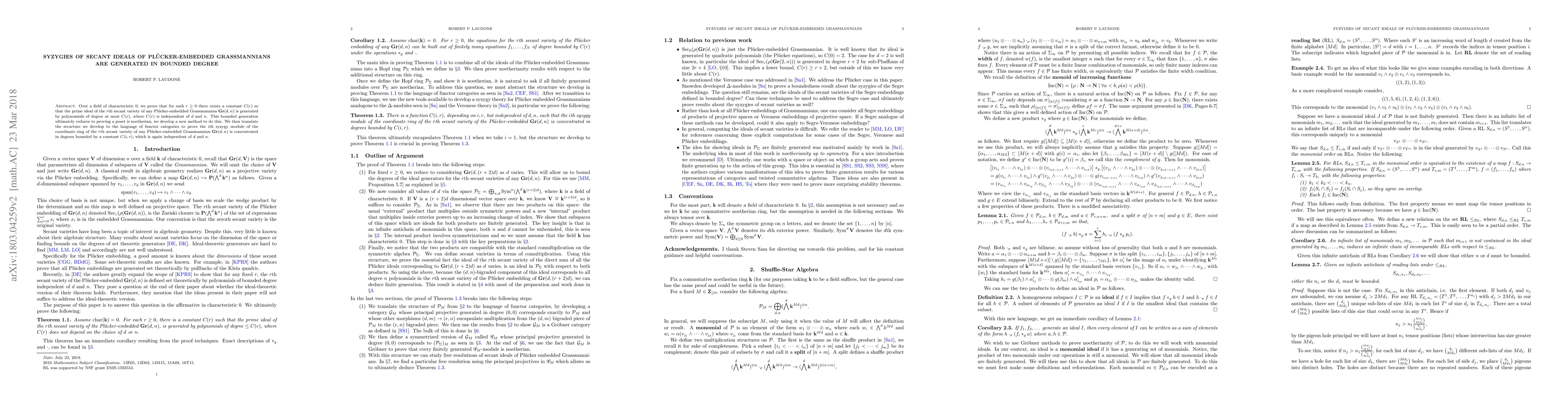 Over a field of characteristic $0$, we prove that for each $r \geq 0$ there exists a constant $C(r)$ so that the prime ideal of the $r$th secant variety of any Pl\"ucker-embedded Grassmannian ${\bf Gr}(d,n)$ is generated by polynomials of degree at most $C(r)$, where $C(r)$ is independent of $d$ and $n$. This bounded generation ultimately reduces to proving a poset is noetherian, we develop a new method to do this. We then translate the structure we develop to the language of functor categories to prove the $i$th syzygy module of the coordinate ring of the $r$th secant variety of any Pl\"ucker-embedded Grassmannian ${\bf Gr}(d,n)$ is concentrated in degrees bounded by a constant $C(i,r)$, which is again independent of $d$ and $n$.