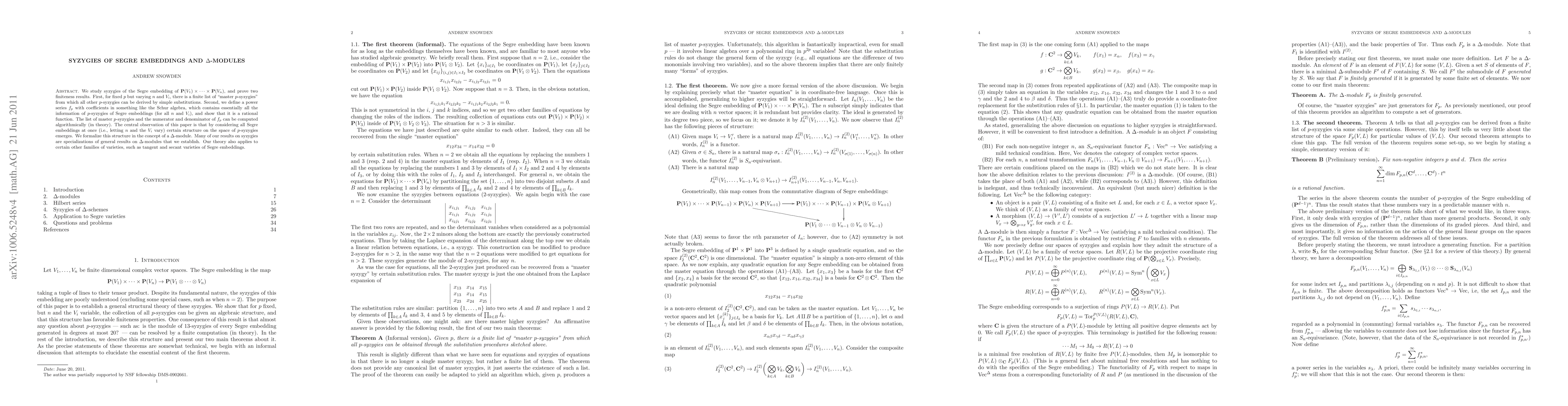 This paper investigates the syzygies associated with Segre embeddings and establishes two finiteness results. It introduces a set of "master p-syzygies" and a rational function summarizing all p-syzygies, both computationally accessible. The study reveals a structure formalized through Delta-modules, which generalizes the findings to other varieties like tangent and secant varieties.