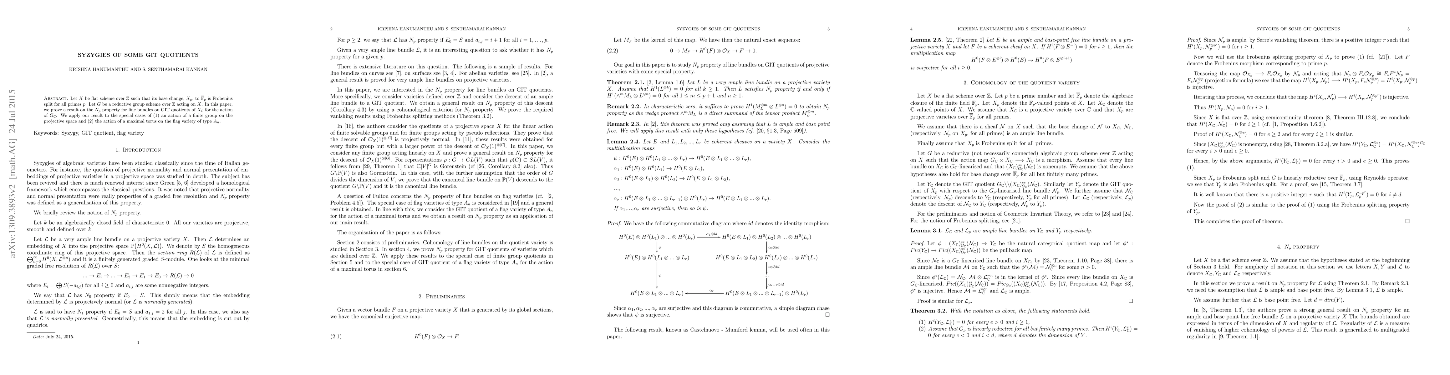 Let $X$ be flat scheme over $\mathbb{Z}$ such that its base change, $X_p$, to $\bar{\mathbb{F}}_p$ is Frobenius split for all primes $p$. Let $G$ be a reductive group scheme over $\mathbb{Z}$ acting on $X$. In this paper, we prove a result on the $N_p$ property for line bundles on GIT quotients of $X_{\mathbb{C}}$ for the action of $G_{\mathbb{C}}$. We apply our result to the special cases of (1) an action of a finite group on the projective space and (2) the action of a maximal torus on the flag variety of type $A_n$.