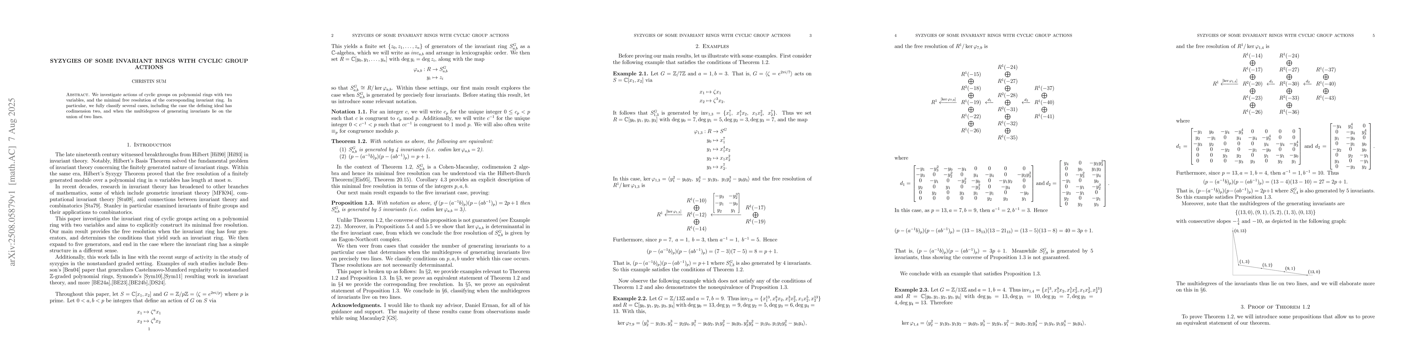We investigate actions of cyclic groups on polynomial rings with two variables, and the minimal free resolution of the corresponding invariant ring. In particular, we fully classify several cases, including the case the defining ideal has codimension two, and when the multidegrees of generating invariants lie on the union of two lines.