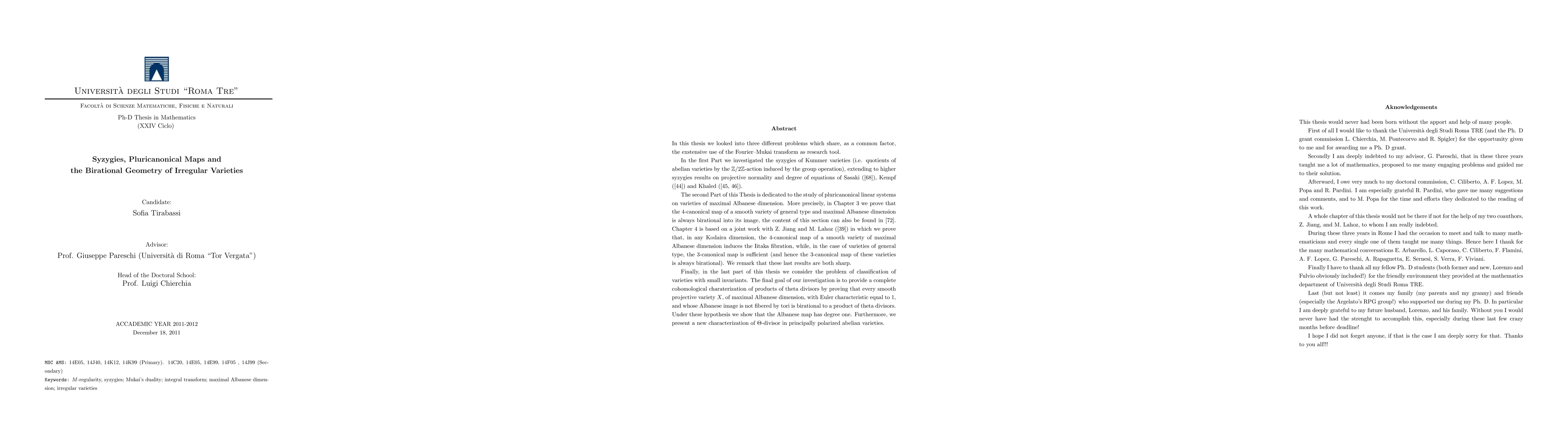 In this thesis we looked into three different problems which share, as a common factor, the exstensive use of the Fourier--Mukai transform as research tool. In the first Part we investigated the syzygies of Kummer varieties (i.e. quotients of abelian varieties by the $\mathbb{Z}/2\Z$-action induced by the group operation), extending to higher syzygies results on projective normality and degree of equations of Sasaki, Kempf, and Khaled. The second Part of this Thesis (partially written in collaboration with Z.Jiang and M. Lahoz) is dedicated to the study of pluricanonical linear systems on varieties of maximal Albanese dimension. Finally, in the last part of this thesis, we consider the problem of classification of varieties with small invariants. The final goal of our investigation is to provide a complete cohomological charaterization of products of theta divisors by proving that every smooth projective variety $X$, of maximal Albanese dimension, with Euler characteristic equal to 1, and whose Albanese image is not fibered by tori is birational to a product of theta divisors. Under these hypothesis we show that the Albanese map has degree one. Furthermore, we present a new characterization of $\Theta$-divisor in principally polarized abelian varieties.