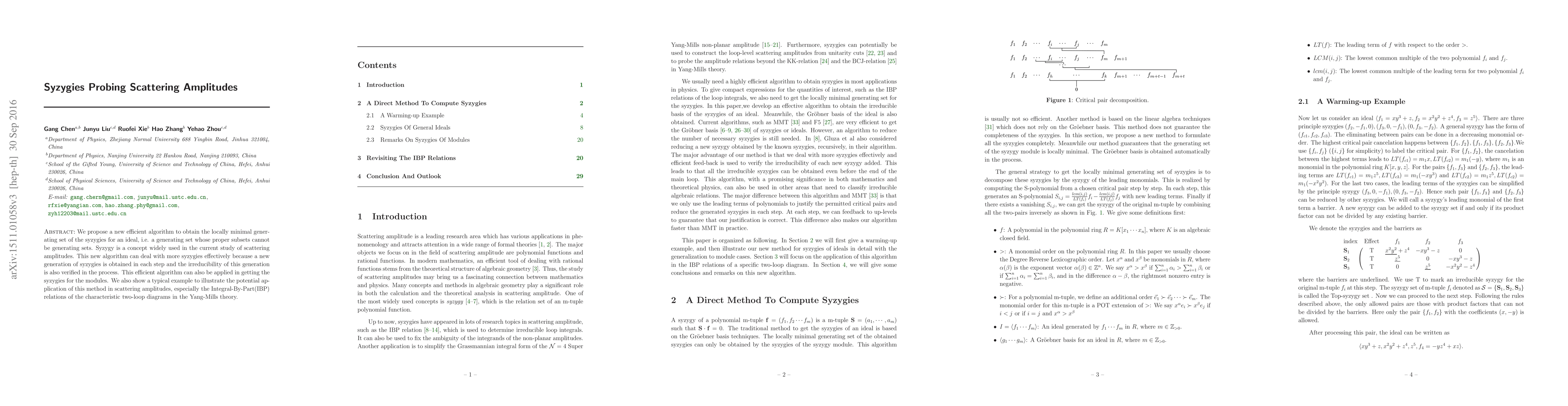 We propose a new efficient algorithm to obtain the locally minimal generating set of the syzygies for an ideal, i.e. a generating set whose proper subsets cannot be generating sets. Syzygy is a concept widely used in the current study of scattering amplitudes. This new algorithm can deal with more syzygies effectively because a new generation of syzygies is obtained in each step and the irreducibility of this generation is also verified in the process. This efficient algorithm can also be applied in getting the syzygies for the modules. We also show a typical example to illustrate the potential application of this method in scattering amplitudes, especially the Integral-By-Part(IBP) relations of the characteristic two-loop diagrams in the Yang-Mills theory.