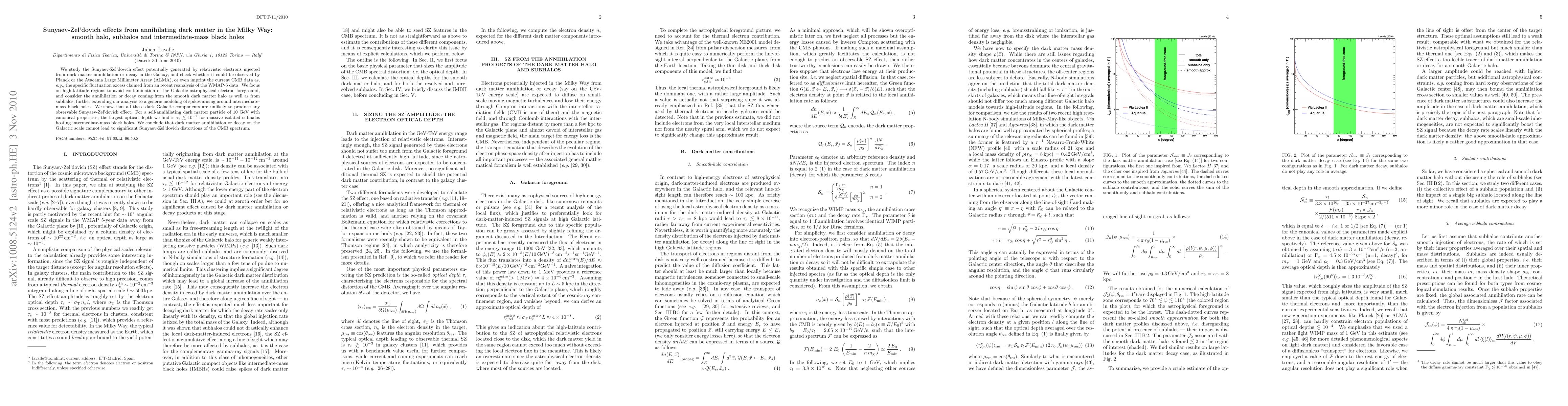 We study the Sunyaev-Zel'dovich effect potentially generated by relativistic electrons injected from dark matter annihilation or decay in the Galaxy, and check whether it could be observed by Planck or the Atacama Large Millimeter Array (ALMA), or even imprint the current CMB data as, e.g., the specific fluctuation excess claimed from an recent reanalysis of the WMAP-5 data. We focus on high-latitude regions to avoid contamination of the Galactic astrophysical electron foreground, and consider the annihilation or decay coming from the smooth dark matter halo as well as from subhalos, further extending our analysis to a generic modeling of spikes arising around intermediate-mass black holes. We show that all these dark Galactic components are unlikely to produce any observable Sunyaev-Zel'dovich effect. For a self-annihilating dark matter particle of 10 GeV with canonical properties, the largest optical depth we find is $\tau_e \lesssim 10^{-7}$ for massive isolated subhalos hosting intermediate-mass black holes. We conclude that dark matter annihilation or decay on the Galactic scale cannot lead to significant Sunyaev-Zel'dovich distortions of the CMB spectrum.