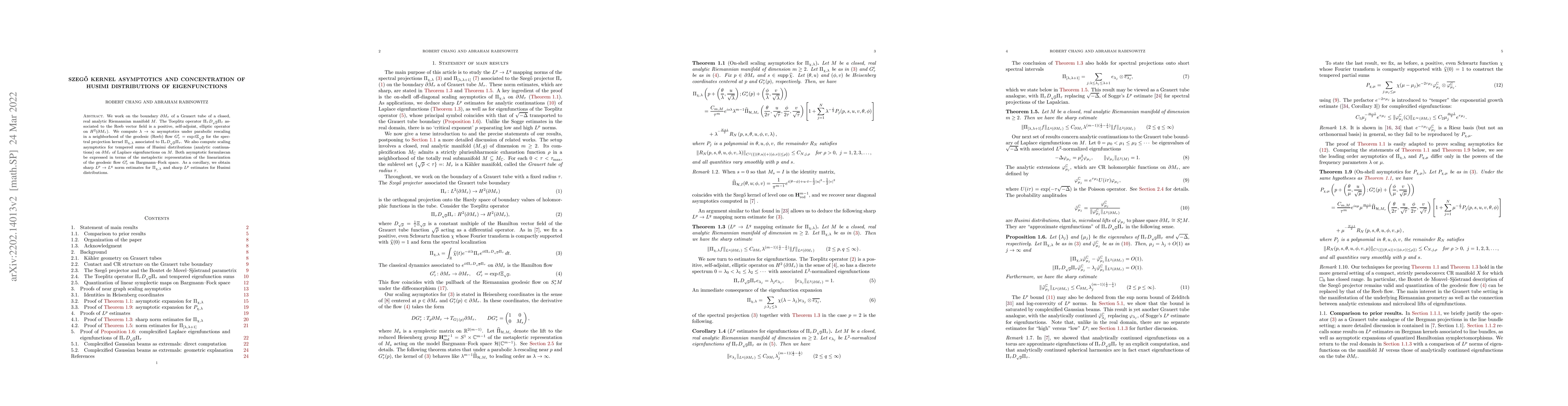 We work on the boundary $\partial M_\tau$ of a Grauert tube of a closed, real analytic Riemannian manifold $M$. The Toeplitz operator $\Pi_\tau D_{\sqrt{\rho}} \Pi_\tau$ associated to the Reeb vector field is a positive, self-adjoint, elliptic operator on $H^2(\partial M_\tau)$. We compute $\lambda \to \infty$ asymptotics under parabolic rescaling in a neighborhood of the geodesic (Reeb) flow $G^{t}_{\tau} = \exp t\Xi_{\sqrt{\rho}}$ for the spectral projection kernel $\Pi_{\chi, \lambda}$ associated to $\Pi_\tau D_{\sqrt{\rho}} \Pi_\tau$. We also compute scaling asymptotics for tempered sums of Husimi distributions (analytic continuations) on $\partial M_\tau$ of Laplace eigenfunctions on $M$. Both asymptotic formulae can be expressed in terms of the metaplectic representation of the linearization of the geodesic flow $G^{t}_\tau$ on Bargmann--Fock space. As a corollary, we obtain sharp $L^p \to L^{q}$ norm estimates for $\Pi_{\chi, \lambda}$ and sharp $L^p$ estimates for Husimi distributions.