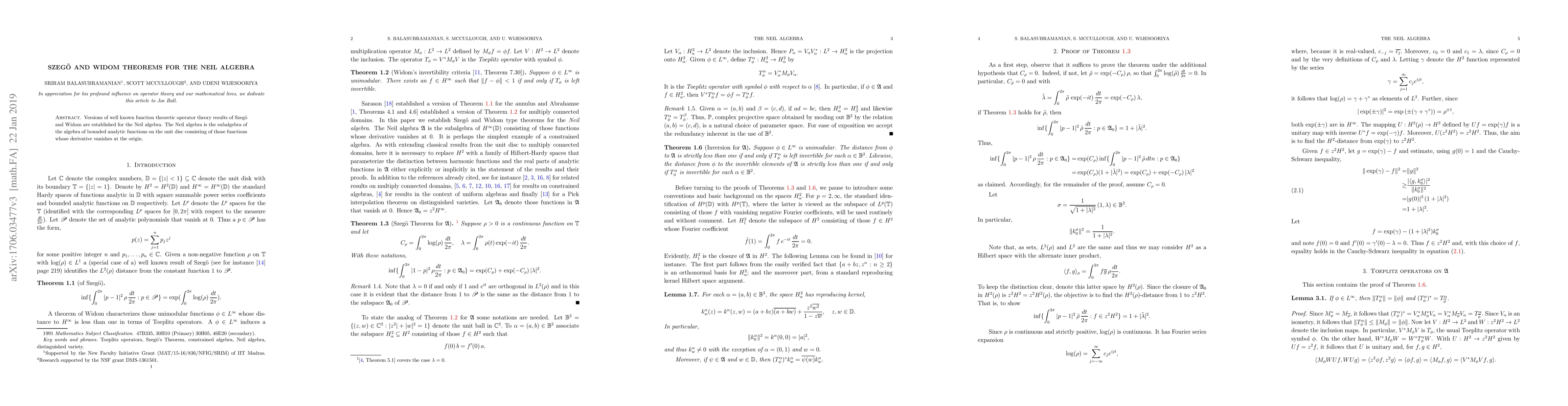 Versions of well known function theoretic operator theory results of Szego and Widom are established for the Neil algebra. The Neil algebra is the subalgebra of the algebra of bounded analytic functions on the unit disc consisting of those functions whose derivative vanishes at the origin.