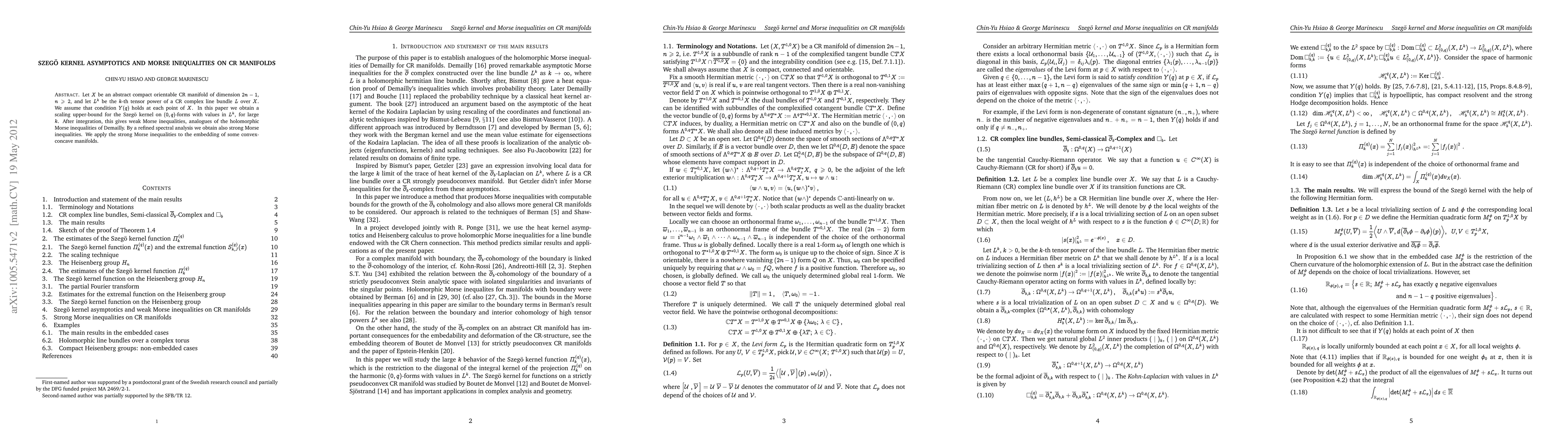 This paper investigates the Szegő kernel asymptotics on compact orientable CR manifolds with a Cauchy-Riemann complex line bundle, deriving scaling upper-bounds and weak Morse inequalities analogous to holomorphic Morse inequalities. It also establishes strong Morse inequalities through refined spectral analysis, applied to the embedding of convex-concave manifolds.