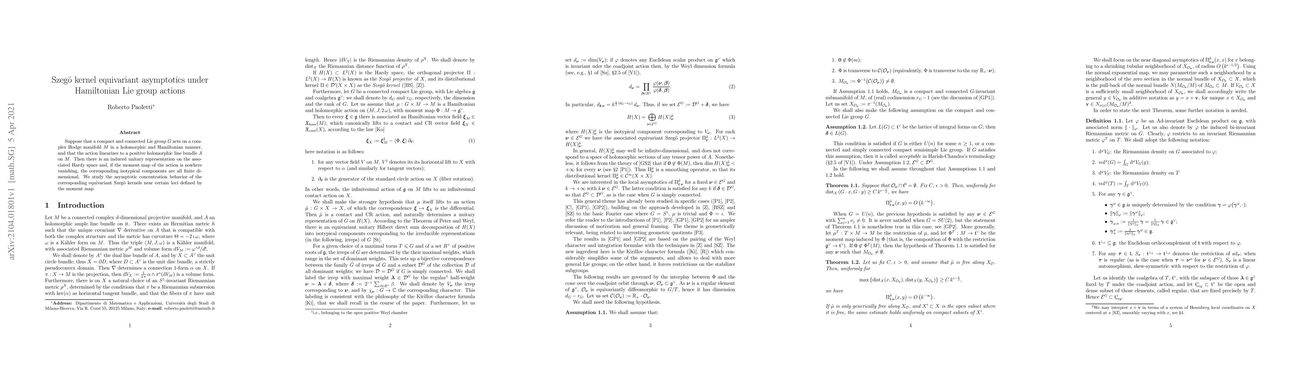 This paper investigates the asymptotic behavior of equivariant Szegő kernels on a complex Hodge manifold under the action of a compact, connected Lie group, focusing on the concentration near loci defined by the moment map when the action is Hamiltonian and linearizes to a positive holomorphic line bundle. The study reveals finite-dimensionality of isotypical components under certain conditions.
