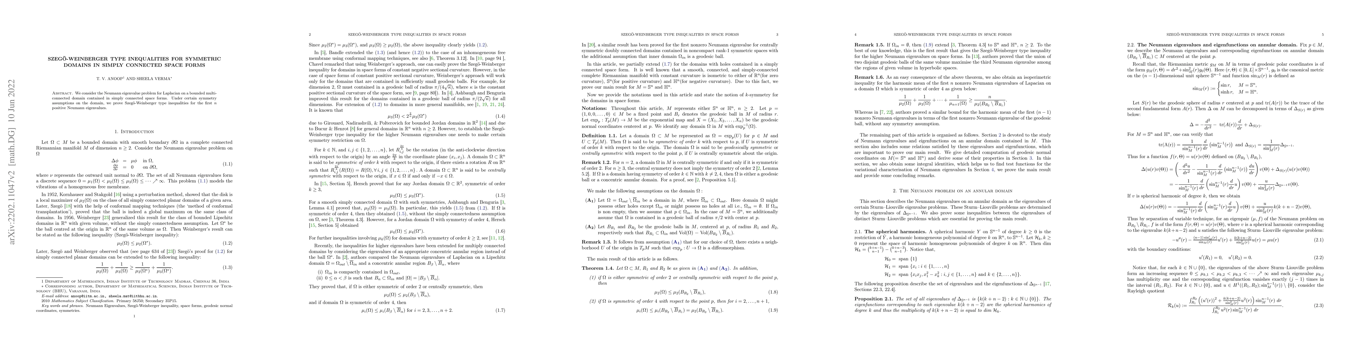 Researchers prove Szeg"{o}-Weinberger type inequalities for symmetric domains in simply connected space forms, providing new insights into the Neumann eigenvalue problem for Laplacian on multi-connected domains.
