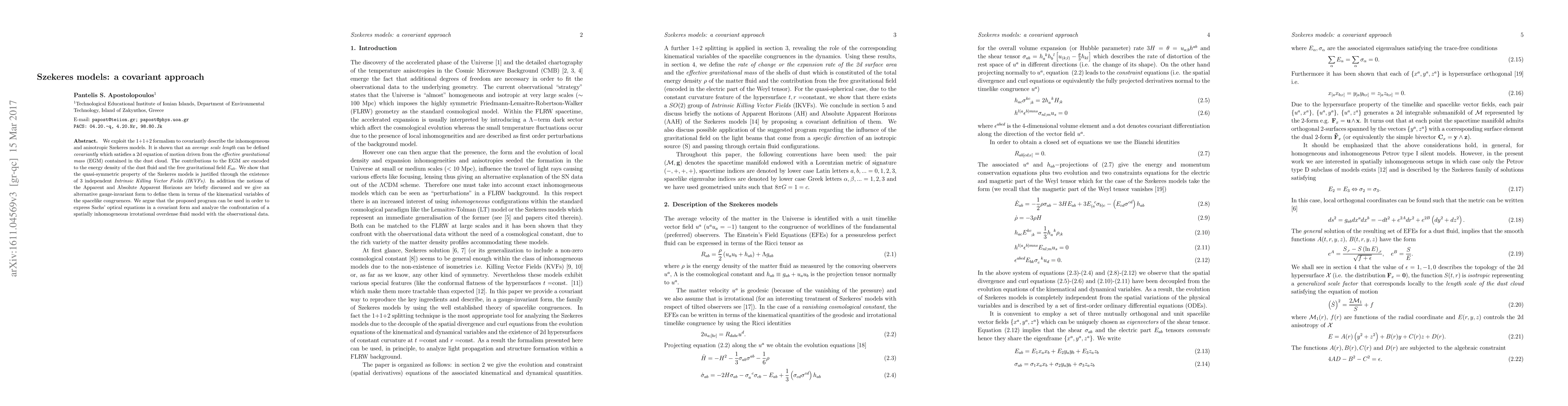 This paper uses the 1+1+2 formalism to covariantly describe Szekeres models, defining an average scale length driven by effective gravitational mass. The quasi-symmetry of these models is justified through three independent Intrinsic Killing Vector Fields, and alternative gauge-invariant definitions for Apparent and Absolute Apparent Horizons are provided.