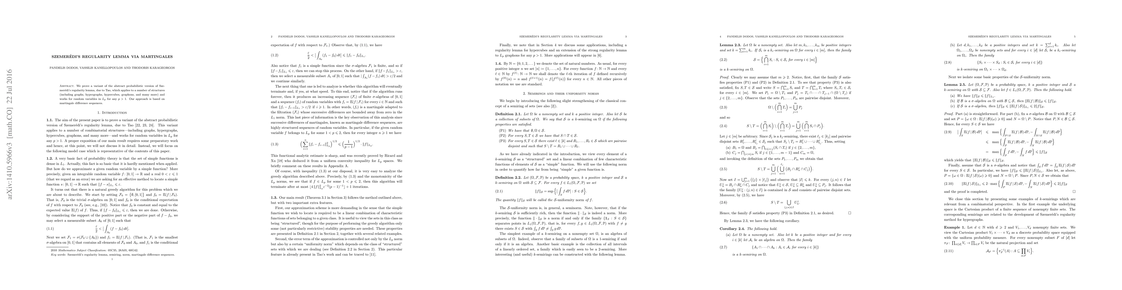 This paper proves a probabilistic variant of Szemer\'edi's regularity lemma using martingale difference sequences, extending the applicability to diverse structures like graphs and graphons, and accommodating random variables in $L_p$ spaces for any $p>1$.