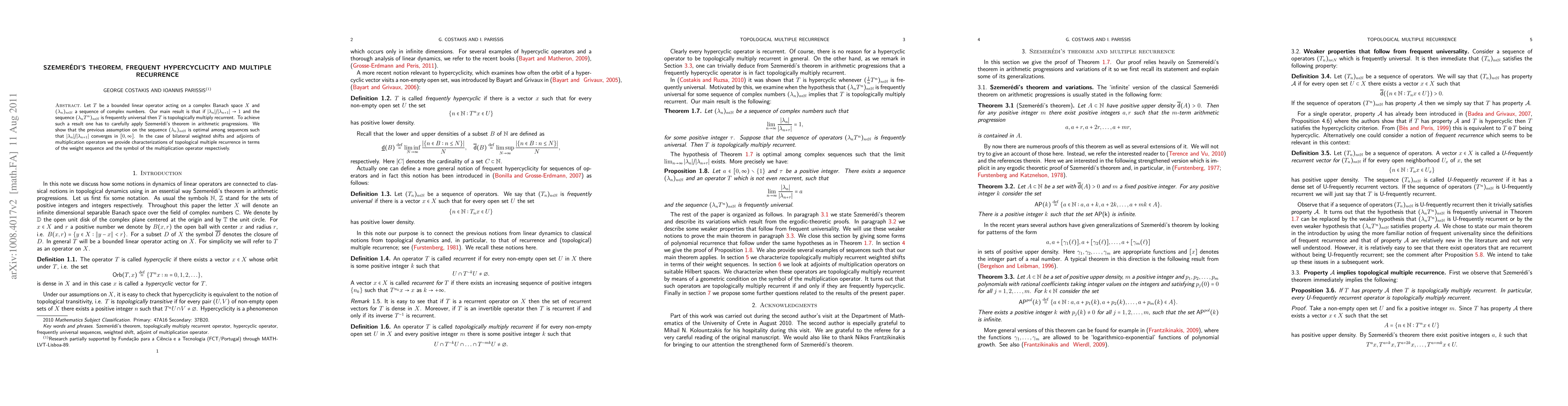 This paper proves that if a bounded linear operator T on a complex Banach space satisfies certain conditions on a sequence of complex numbers, then T is topologically multiply recurrent. The proof leverages Szemeredi's theorem and shows that the assumptions on the sequence are optimal. It also characterizes topological multiple recurrence for bilateral weighted shifts and adjoints of multiplication operators.