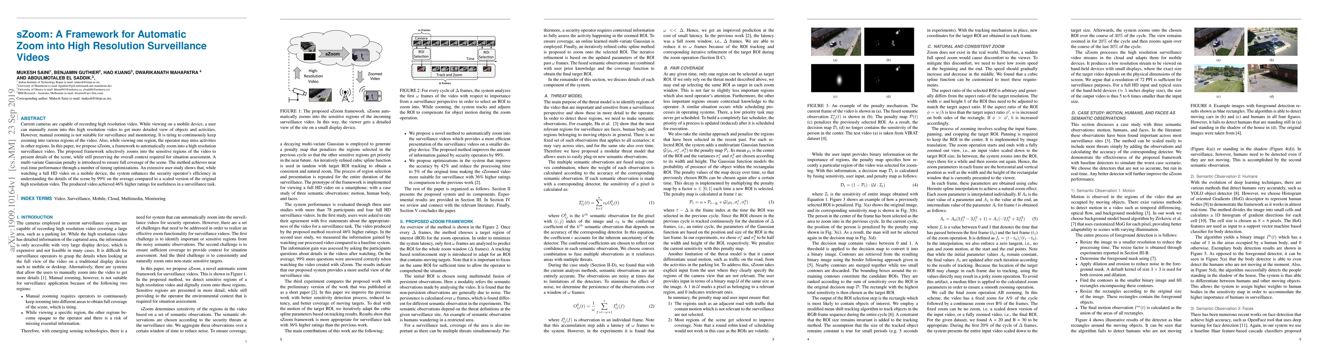 sZoom is a framework for automatically zooming high resolution surveillance videos to enhance detail visibility while maintaining context. It achieves near real-time performance and significantly improves operator efficiency and video usefulness in surveillance tasks, according to an extensive user study.