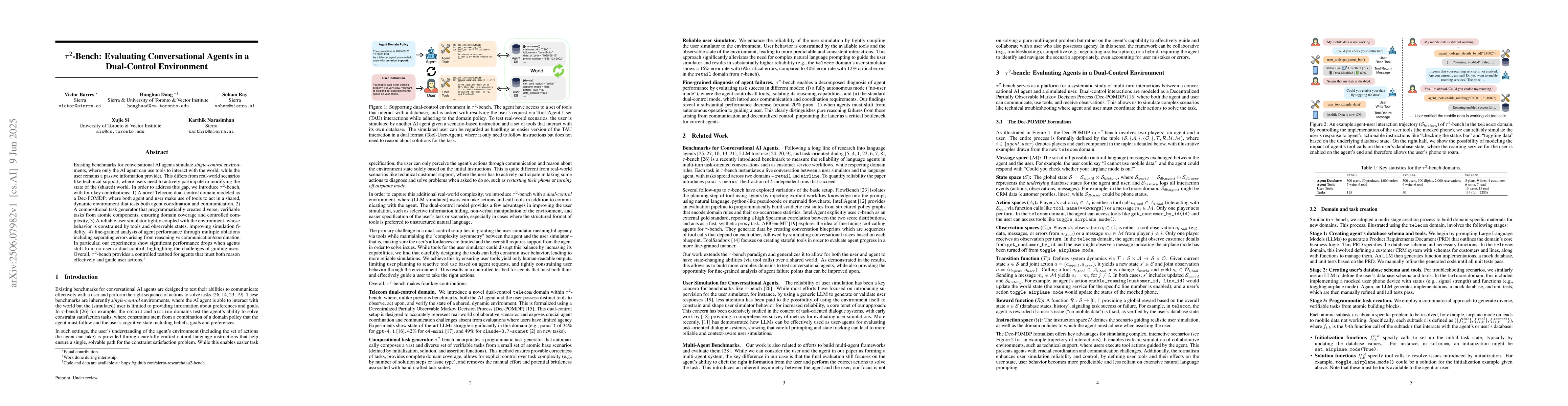 Existing benchmarks for conversational AI agents simulate single-control environments, where only the AI agent can use tools to interact with the world, while the user remains a passive information provider. This differs from real-world scenarios like technical support, where users need to actively participate in modifying the state of the (shared) world. In order to address this gap, we introduce $\tau^2$-bench, with four key contributions: 1) A novel Telecom dual-control domain modeled as a Dec-POMDP, where both agent and user make use of tools to act in a shared, dynamic environment that tests both agent coordination and communication, 2) A compositional task generator that programmatically creates diverse, verifiable tasks from atomic components, ensuring domain coverage and controlled complexity, 3) A reliable user simulator tightly coupled with the environment, whose behavior is constrained by tools and observable states, improving simulation fidelity, 4) Fine-grained analysis of agent performance through multiple ablations including separating errors arising from reasoning vs communication/coordination. In particular, our experiments show significant performance drops when agents shift from no-user to dual-control, highlighting the challenges of guiding users. Overall, $\tau^2$-bench provides a controlled testbed for agents that must both reason effectively and guide user actions.