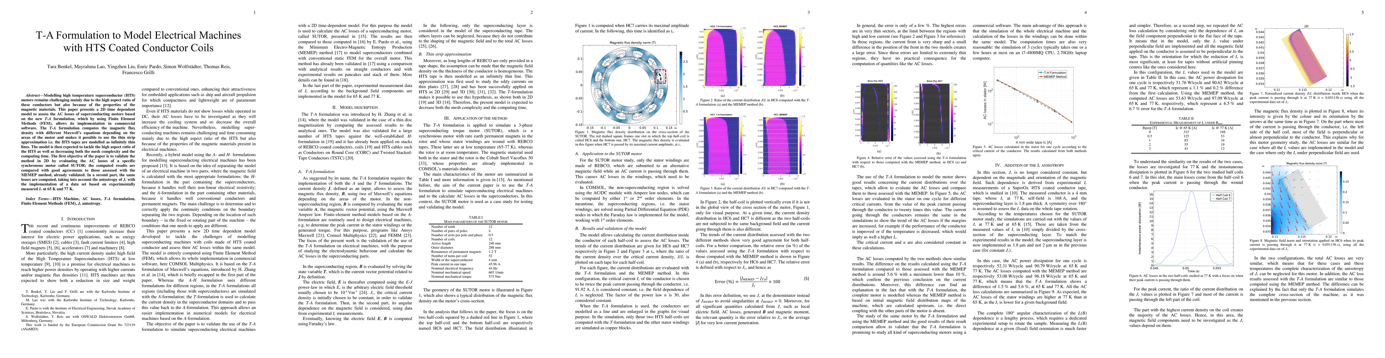 Modelling high temperature superconductor (HTS) motors remains challenging mainly due to the high aspect ratio of these conductors but also because of the properties of the magnetic materials. This paper presents a 2D time dependent model to assess the AC losses of superconducting motors based on the new T-A formulation, which by using Finite Element Methods (FEM), allows its implementation in commercial software. The T-A formulation computes the magnetic flux density with different Maxwell's equations depending on the areas of the motor and makes it possible to use the thin strip approximation i.e. the HTS tapes are modelled as infinitely thin lines. The model is then expected to tackle the high aspect ratio of the HTS as well as decreasing both the mesh complexity and the computing time. The first objective of the paper is to validate the method in 2D by evaluating the AC losses of a specific synchronous motor called SUTOR; the computed results are compared with good agreements to those assessed with the MEMEP method, already validated. In a second part, the same losses are computed, taking into account the anisotropy of Jc with the implementation of a data set based on experimentally measured Ic at 65 K and 77 K.