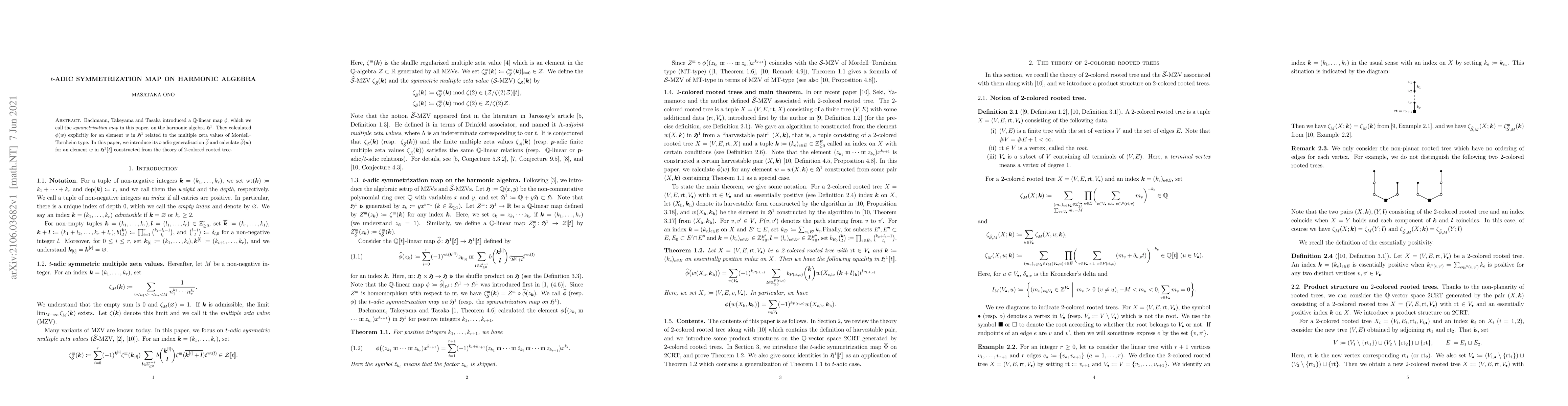 Bachmann, Takeyama and Tasaka introduced a $\mathbb{Q}$-linear map $\phi$, which we call the symmetrization map in this paper, on the harmonic algebra $\mathfrak{H}^1$. They calculated $\phi(w)$ explicitly for an element $w$ in $\mathfrak{H}^1$ related to the multiple zeta values of Mordell--Tornheim type. In this paper, we introduce its $t$-adic generalization $\widehat{\phi}$ and calculate $\widehat{\phi}(w)$ for an element $w$ in $\mathfrak{H}^1[[t]]$ constructed from the theory of $2$-colored rooted tree.