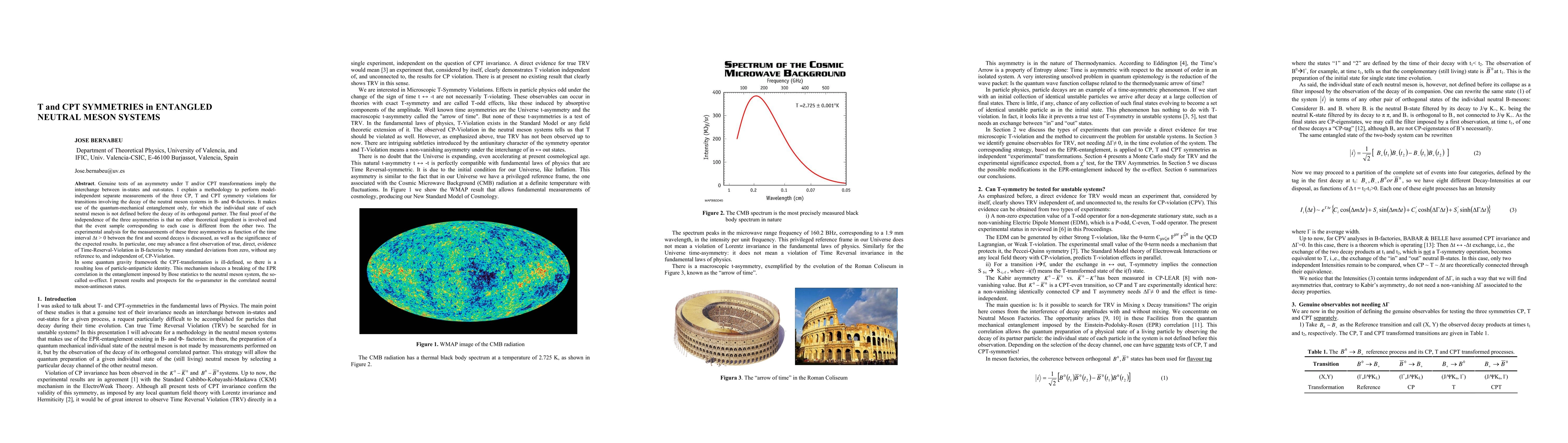 Genuine tests of an asymmetry under T and/or CPT transformations imply the interchange between in-states and out-states. I explain a methodology to perform model-indepedent separate measurements of the three CP, T and CPT symmetry violations for transitions involving the decay of the neutral meson systems in B- and {\Phi}-factories. It makes use of the quantum-mechanical entanglement only, for which the individual state of each neutral meson is not defined before the decay of its orthogonal partner. The final proof of the independence of the three asymmetries is that no other theoretical ingredient is involved and that the event sample corresponding to each case is different from the other two. The experimental analysis for the measurements of these three asymmetries as function of the time interval {\Delta}t > 0 between the first and second decays is discussed, as well as the significance of the expected results. In particular, one may advance a first observation of true, direct, evidence of Time-Reserval-Violation in B-factories by many standard deviations from zero, without any reference to, and independent of, CP-Violation. In some quantum gravity framework the CPT-transformation is ill-defined, so there is a resulting loss of particle-antiparticle identity. This mechanism induces a breaking of the EPR correlation in the entanglement imposed by Bose statistics to the neutral meson system, the so-called {\omega}-effect. I present results and prospects for the {\omega}-parameter in the correlated neutral meson-antimeson states.