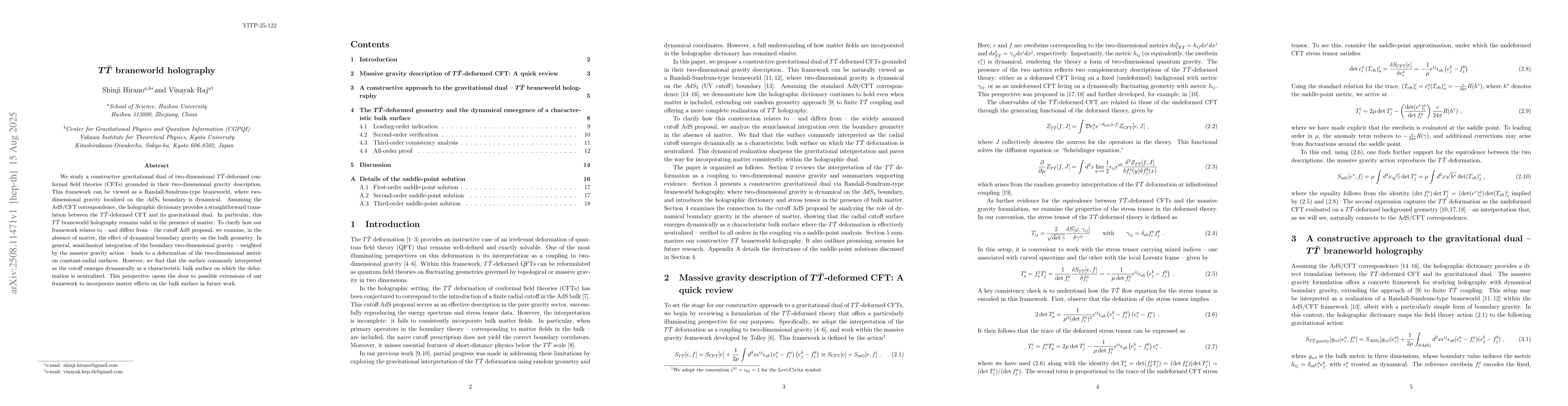 We study a constructive gravitational dual of two-dimensional $T\bar{T}$-deformed conformal field theories (CFTs) grounded in their two-dimensional gravity description. This framework can be viewed as a Randall-Sundrum-type braneworld, where two-dimensional gravity localized on the $AdS_3$ boundary is dynamical. Assuming the AdS/CFT correspondence, the holographic dictionary provides a straightforward translation between the $T\bar{T}$-deformed CFT and its gravitational dual. In particular, this $T\bar{T}$ braneworld holography remains valid in the presence of matter. To clarify how our framework relates to -- and differs from -- the cutoff AdS proposal, we examine, in the absence of matter, the effect of dynamical boundary gravity on the bulk geometry. In general, semiclassical integration of the boundary two-dimensional gravity -- weighted by the massive gravity action -- leads to a deformation of the two-dimensional metric on constant-radial surfaces. However, we find that the surface commonly interpreted as the cutoff emerges dynamically as a characteristic bulk surface on which the deformation is neutralized. This perspective opens the door to possible extensions of our framework to incorporate matter effects on the bulk surface in future work.