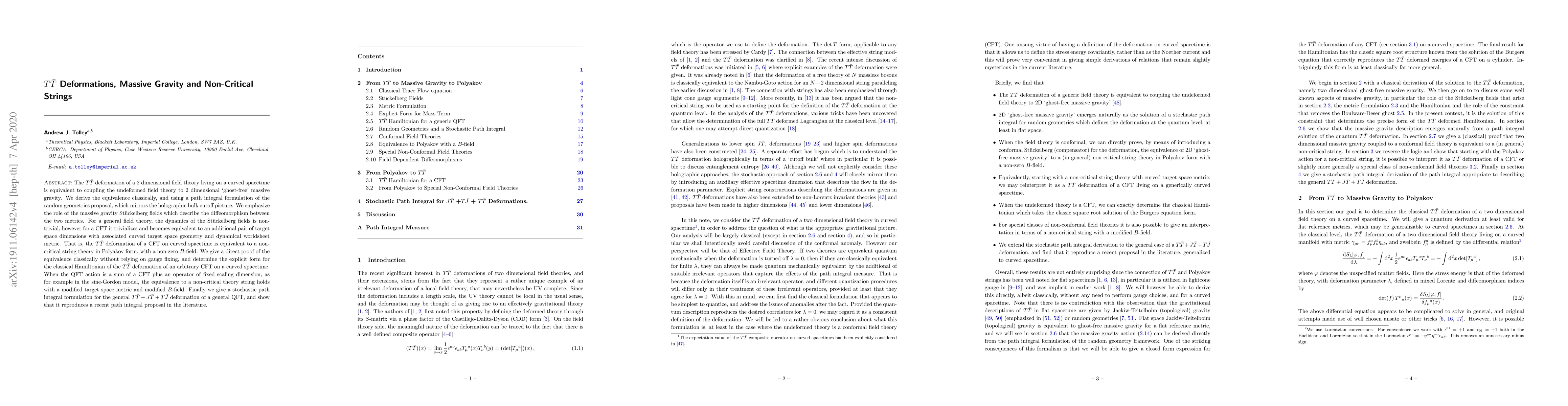 The paper establishes a classical equivalence between $T \bar T$ deformations in 2D field theories and coupling to 2D ghost-free massive gravity, showing that this deformation corresponds to a non-critical string theory in a curved target space. The equivalence is demonstrated without gauge fixing and extends to general QFTs with additional operators.